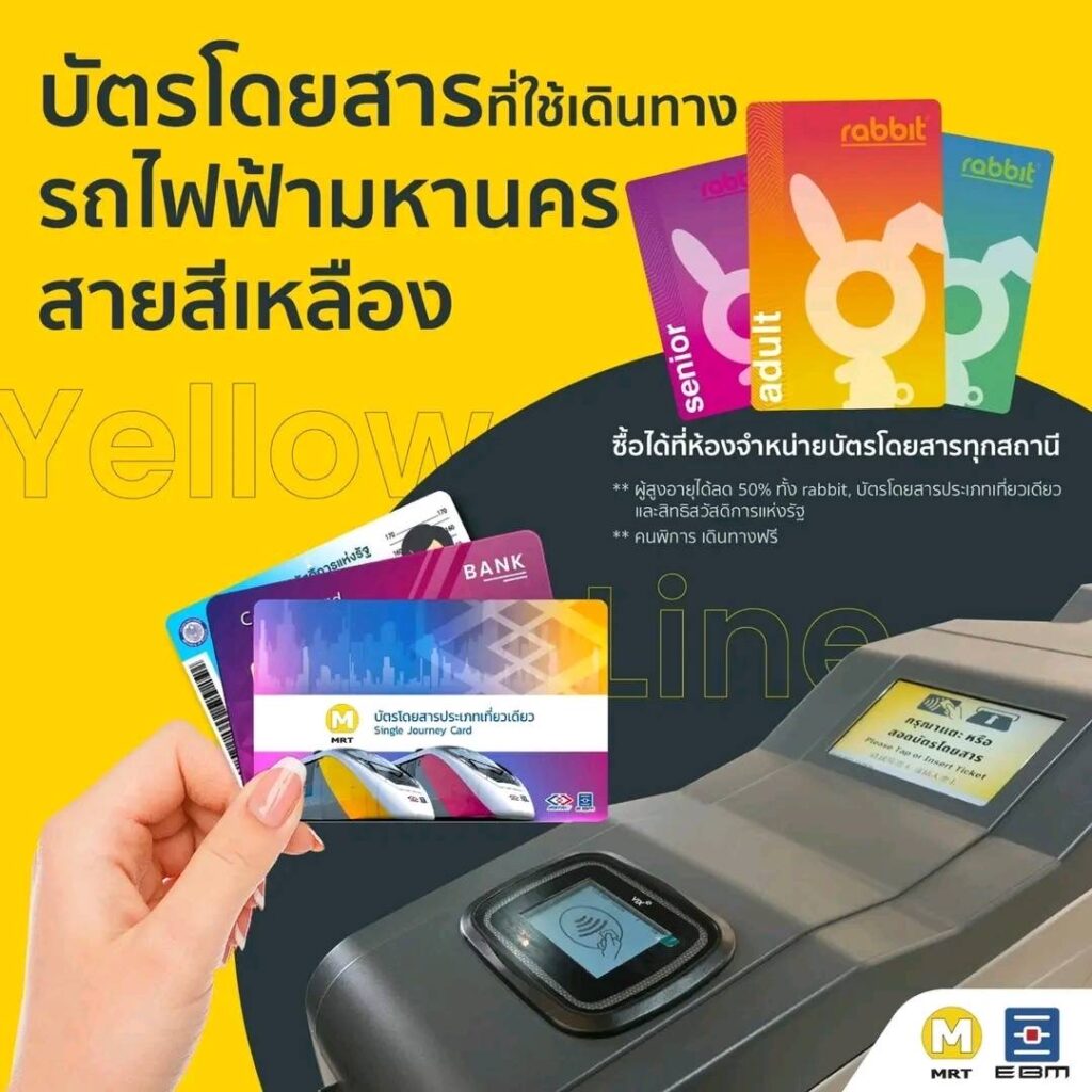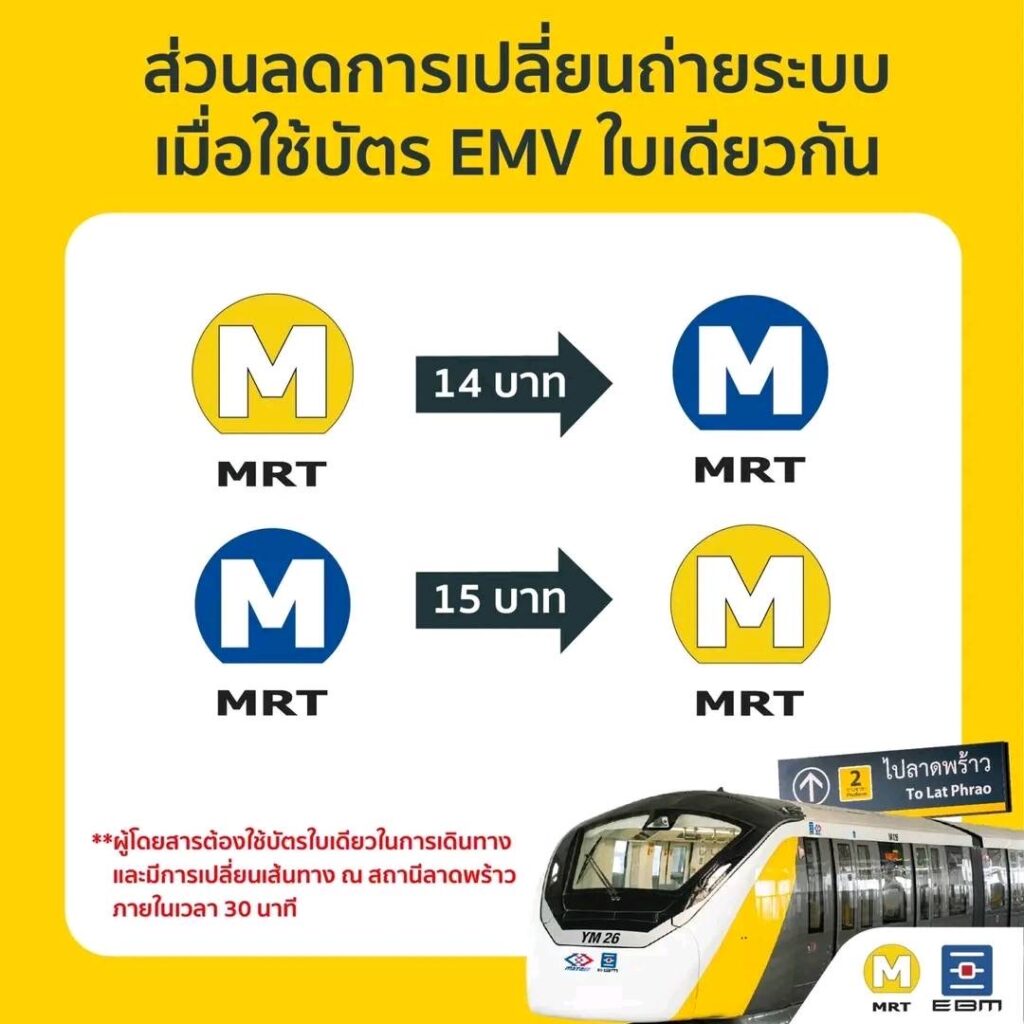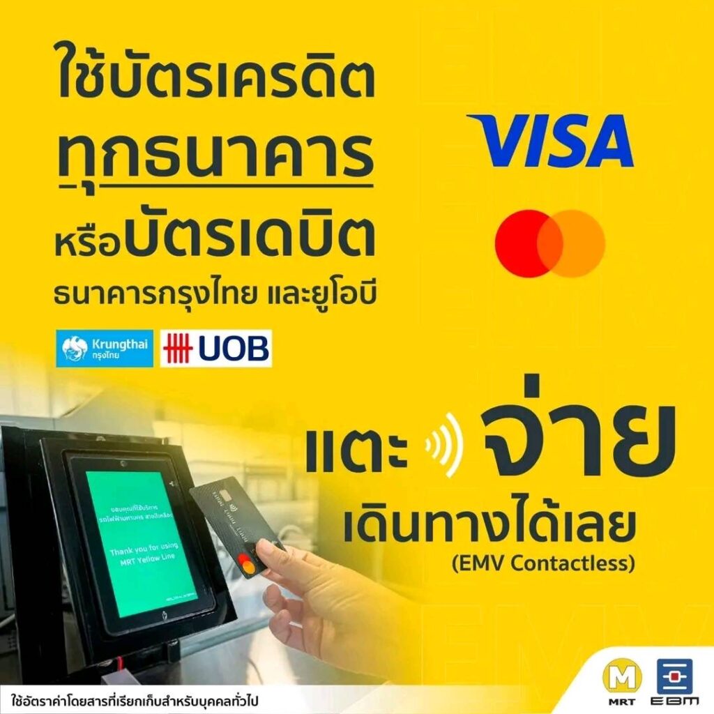 3+บัตร EMV Contactless โดยใช้บัตรเครดิตวีซ่า (VISA) หรือมาสเตอร์การ์ด (Mastercard) ของธนาคารใดก็ได้รวมถึงบัตรเดบิตของธนาคารกรุงไทย บัตรเดบิตของธนาคารยูโอบี และบัตรเดบิต Play Card (สมัครผ่านแอปพลิเคชันเป๋าตังค์) ที่มีสัญลักษณ์ Contactless Payment บนหน้าบัตรหรือหลังบัตร แตะเข้าและแตะออกระบบรถไฟฟ้าที่จุดให้บริการเครื่อง EDC บริเวณประตูพิเศษ (SwingGate) ได้ โดยมีแผนจะขยายจุดให้บริการเพิ่มเติมให้ครบทุกประตูจัดเก็บค่าโดยสารอัตโนมัติ (AFC Gate) ในลำดับถัดไปซึ่งผู้โดยสารที่เดินทางเชื่อมต่อระหว่างระบบรถไฟฟ้า MRT สายสีเหลือง –MRT สายสีน้ำเงิน (สายเฉลิมรัชมงคล) ที่สถานีลาดพร้าว และชำระค่าโดยสารด้วยบัตรEMVContactless ใบเดียวกัน จะได้รับส่วนลดการเปลี่ยนถ่ายระบบ หากเดินทางเชื่อมต่อภายในระยะเวลา 30 นาที