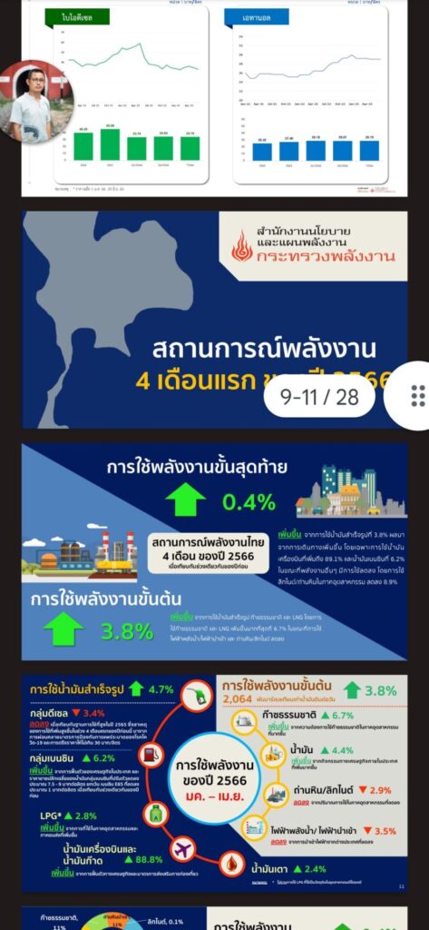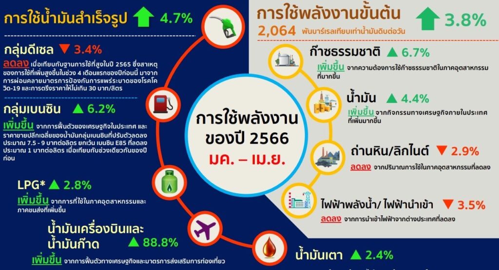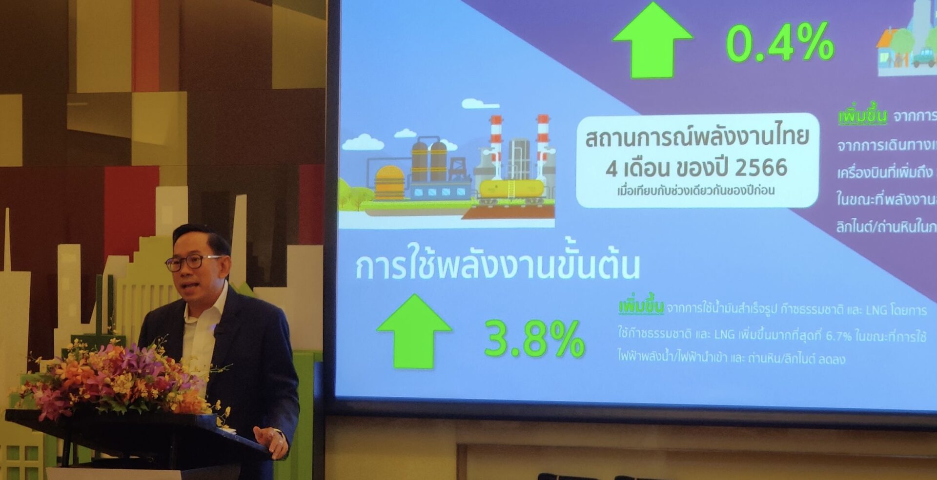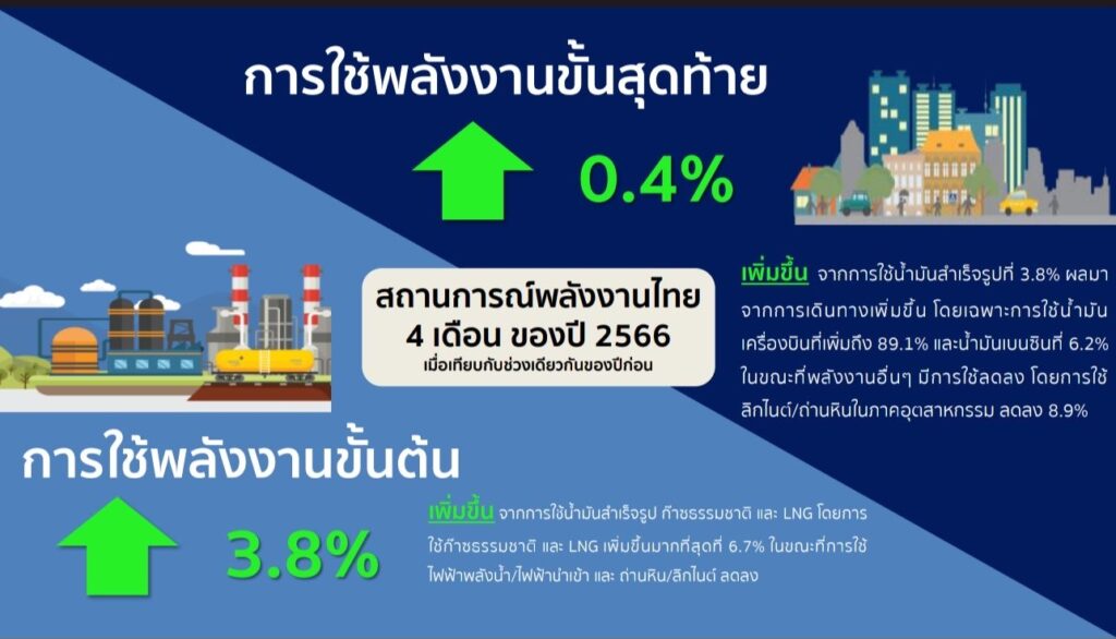 นายวัฒนพงษ์ คุโรวาท ผู้อำนวยการสำนักงานนโยบายและแผนพลังงาน (สนพ.) เปิดเผยถึงสถานการณ์พลังงานในช่วง 4 เดือนของปี 2566 พบว่าการใช้พลังงานขั้นต้นเพิ่มขึ้นร้อยละ 3.8 จากการขยายตัวทางเศรษฐกิจอย่างต่อเนื่องหลังจากสถานการณ์การแพร่ระบาดของโรคโควิด-19 มีแนวโน้มที่ดีขึ้น ทั้งนี้ ในส่วนของการใช้พลังงานขั้นสุดท้ายเพิ่มขึ้นร้อยละ 0.4 โดยเพิ่มขึ้นมาจากการใช้น้ำมันสำเร็จรูป ร้อยละ 3.8 ผลมาจากการเดินทางเพิ่มขึ้น โดยเฉพาะการใช้น้ำมันเครื่องบินที่เพิ่มถึง ร้อยละ 89.1 และน้ำมันเบนซิน ร้อยละ 6.2 ในขณะที่พลังงานอื่นๆ มีการใช้ลดลง โดยการใช้ลิกไนต์/ถ่านหินในภาคอุตสาหกรรม ลดลงร้อยละ 8.9 ซึ่งสถานการณ์พลังงานรายเชื้อเพลิงในช่วง 4 เดือนแรกของปี 2566 สรุปได้ดังนี้