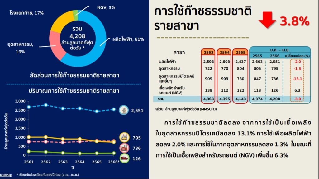 ก๊าซธรรมชาติ และก๊าซโซลีนธรรมชาติ (NGL) ลดลงร้อยละ 3.8 อยู่ที่ระดับ 4,208 ล้านลูกบาศก์ฟุตต่อวัน โดยลดลงจากการใช้เป็นเชื้อเพลิงในอุตสาหกรรมปิโตรเคมี การใช้เพื่อผลิตไฟฟ้าในโรงงาน และการใช้ในภาคอุตสาหกรรมที่13.1 2.0 และ 1.3 ตามลำดับ ในขณะที่การใช้เป็นเชื้อเพลิงสำหรับรถยนต์ (NGV) เพิ่มขึ้นร้อยละ 6.3
