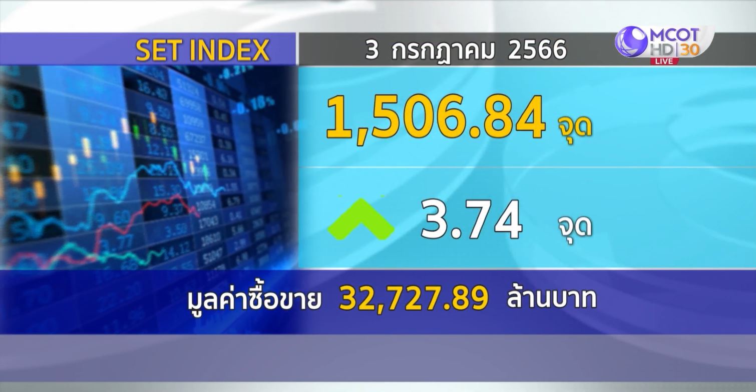 กทม. 3 ก.ค.- SET ปิดวันนี้ที่ 1,506.84 จุด เพิ่มขึ้น 3.74 จุด (+0.25%) มูลค่าซื้อขาย 32,732.05 ล้านบาท