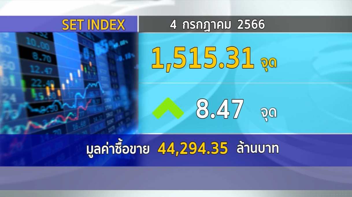 กทม. 4 ก.ค.-SET ปิดวันนี้ที่ 1,515.31 จุด เพิ่มขึ้น 8.47 จุด (+0.56%) มูลค่าซื้อขาย 44,294.35 ล้านบาท