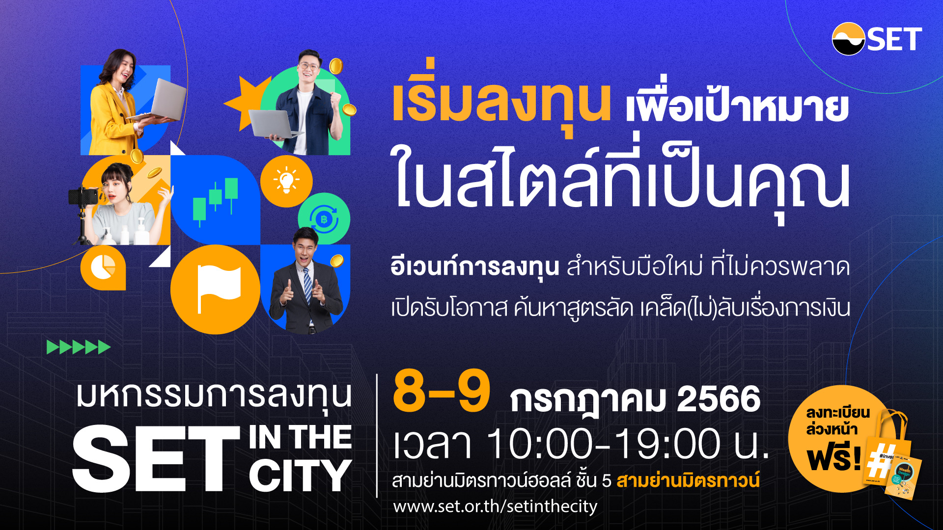 ตลาดหลักทรัพย์แห่งประเทศไทย จัดมหกรรมการลงทุน SET in the City 2023 ภายใต้แนวคิด “เริ่มลงทุนเพื่อเป้าหมาย ในสไตล์ที่เป็นคุณ” วันที่ 8-9 ก.ค. 2566 ที่สามย่านมิตรทาวน์ฮอลล์ ชั้น 5 สามย่านมิตรทาวน์ กิจกรรมออฟไลน์เต็มรูปแบบครั้งแรกนับจากเกิดสถานการณ์ COVID-19 โดยร่วมกับองค์กรในตลาดทุนกว่า 40 องค์กร ทั้งกลุ่มตลาดหลักทรัพย์ฯ บริษัทหลักทรัพย์ บริษัทหลักทรัพย์จัดการลงทุน บริษัทนายหน้าซื้อขายหน่วยลงทุน เพื่อสร้างโอกาสให้ผู้ลงทุนมือใหม่ได้รับข้อมูลความรู้ที่ครบถ้วน ครอบคลุมทั้งการวางแผนการเงินและลงทุนเพื่ออนาคต