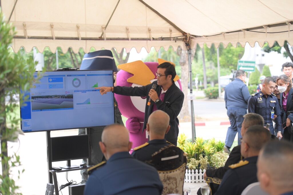 PEA นำระบบดิจิทัลมาช่วยอนุรักษ์และจัดการพลังงานไฟฟ้าให้กองบัญชาการกองทัพอากาศแบบครบวงจร ตั้งแต่ตรวจสอบ วิเคราะห์การใช้พลังงาน ออกแบบและติดตั้งระบบ Floating Solar ขนาดกำลังการผลิตติดตั้ง 999.9 กิโลวัตต์ สามารถผลิตกำลังไฟฟ้าได้เดือนละ 112,000 หน่วย ประหยัดค่าใช้จ่ายด้านสาธารณูปโภคได้ 81,000บาท ต่อเดือน หรือคิดเป็น 972,000 บาท ต่อปี และสามารถลดปริมาณการปล่อยก๊าซคาร์บอนไดออกไซด์ได้ประมาณ 670 ตันคาร์บอนไดออกไซด์เทียบเท่าต่อปี พร้อมดูแลและบำรุงรักษาระบบตลอดระยะเวลา 25 ปี มีระบบติดตามผลการผลิตไฟฟ้า หรือ Energy Monitoring System ช่วยให้ติดตามหน่วยผลิตไฟฟ้าจากระบบ Floating Solar ได้แบบ Realtime และทราบภาพรวมการใช้พลังงานจากระบบ Floating Solar เพื่อนำมากำหนดนโยบายและเป้าหมายการลดใช้ไฟฟ้าได้อย่างมีประสิทธิภาพเพื่อการประหยัดพลังงานในกองบัญชาการกองทัพอากาศ ถือเป็นการช่วยลดต้นทุนค่าไฟฟ้าและลดการปล่อยก๊าซเรือนกระจก
