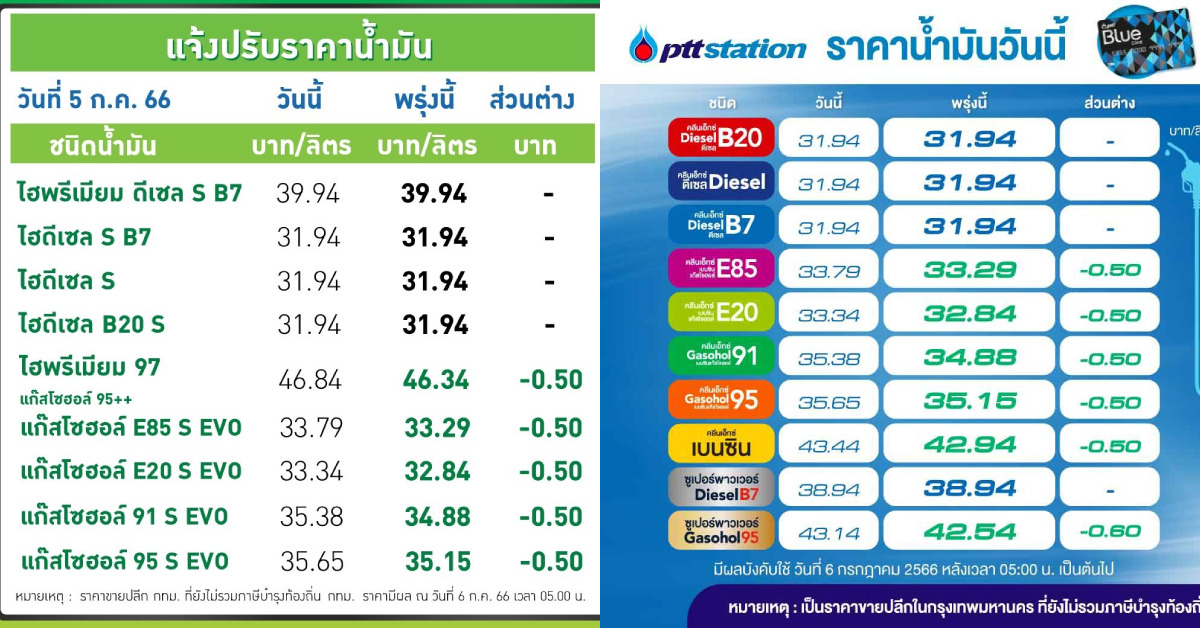 โดยราคาขายปลีก PTT Station จะเป็นดังนี้ ULG = 42.94, GSH95 = 35.15, E20 = 32.84, GSH91 = 34.88, E85 = 33.29, พรีเมี่ยม GSH95 = 42.54, HSD-B7 = 31.94, HSD-B10 = 31.94, HSD-B20 = 31.94, พรีเมี่ยมดีเซล B7 = 38.94 บาทต่อลิตร โดยราคาขายปลีกข้างต้นยังไม่รวมภาษีบำรุงกรุงเทพมหานคร