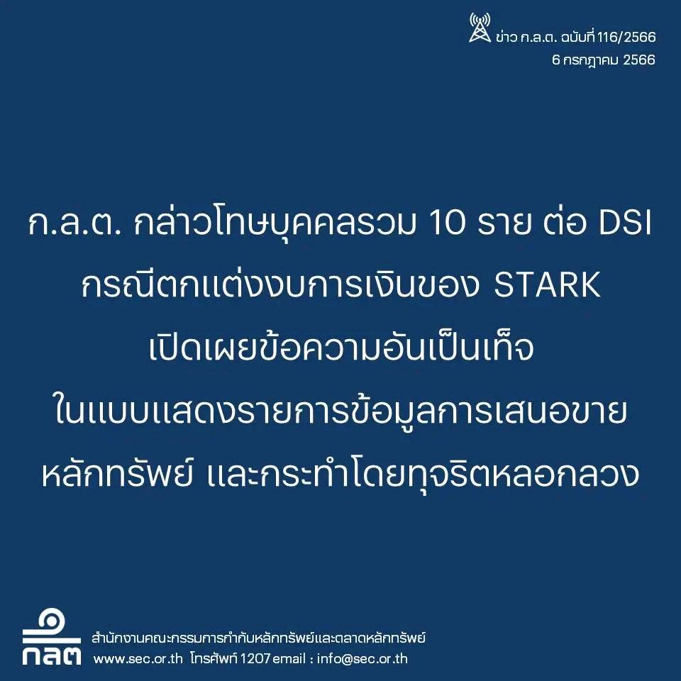 ก.ล.ต. กล่าวโทษบริษัท สตาร์ค คอร์เปอเรชั่น จำกัด (มหาชน) (STARK) กรรมการ อดีตกรรมการและอดีตผู้บริหารของ STARK รวม 10 ราย ต่อกรมสอบสวนคดีพิเศษ (DSI) กรณีร่วมกันกระทำหรือยินยอมให้มีการลงข้อความเท็จในบัญชีเอกสารของ STARK และบริษัทย่อย ในช่วงปี 2564 – 2565 เพื่อลวงบุคคลใด ๆ และเปิดเผยงบการเงินในแบบแสดงรายการข้อมูลการเสนอขายตราสารหนี้และร่างหนังสือชี้ชวนที่เชื่อได้ว่ามีการตกแต่งงบ รวมทั้งปกปิดความจริงในข้อมูล factsheet เสนอขายหุ้นกู้ STARK ซึ่งการกระทำดังกล่าวเป็นการกระทำโดยทุจริตหลอกลวง และทำให้ได้ไปซึ่งทรัพย์สินจากประชาชนผู้ถูกหลอกลวง พร้อมกันนี้ได้ส่งเรื่องต่อไปยังสำนักงานป้องกันและปราบปรามการฟอกเงิน (ปปง.)