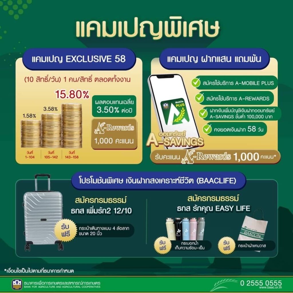 ด้านผลิตภัณฑ์เงินฝากสงเคราะห์ชีวิต ธ.ก.ส. มุ่งส่งเสริมการสร้างภูมิคุ้มกันทางการเงินและการออมแบบยั่งยืนด้วยเงินฝากสงเคราะห์ชีวิต พิเศษเฉพาะในงาน! เมื่อสมัครกรมธรรม์ ธกส เพิ่มรัก2 12/10 รับทันที กระเป๋าเดินทางล้อลากขนาด 20 นิ้ว หรือสมัครกรมธรรม์ ธกส รักคุณ Easy Life ผ่านแอปพลิเคชัน A-Insure และแอปพลิเคชัน BAACLife Online รับเลย Cashback สูงสุด 10% (โดยจะได้รับเงินคืนภายใน 30 วันหลังจากที่ชำระเงิน) และกระเป๋าผ้าแคนวาส หรือกระบอกน้ำเก็บความร้อน – เย็น โดยลูกค้าที่สมัครกรมธรรม์เงินฝากสงเคราะห์ชีวิตทุกประเภท จะได้รับสิทธิลุ้นรับทองคำในแคมเปญปลูกรัก รับโชค น้ำหนักกว่า 90 บาท มูลค่ากว่า 2.9 ล้านบาท 1 สิทธิ์/กรมธรรม์ ระยะเวลาตั้งแต่วันนี้จนถึง 15 ตุลาคม 2566