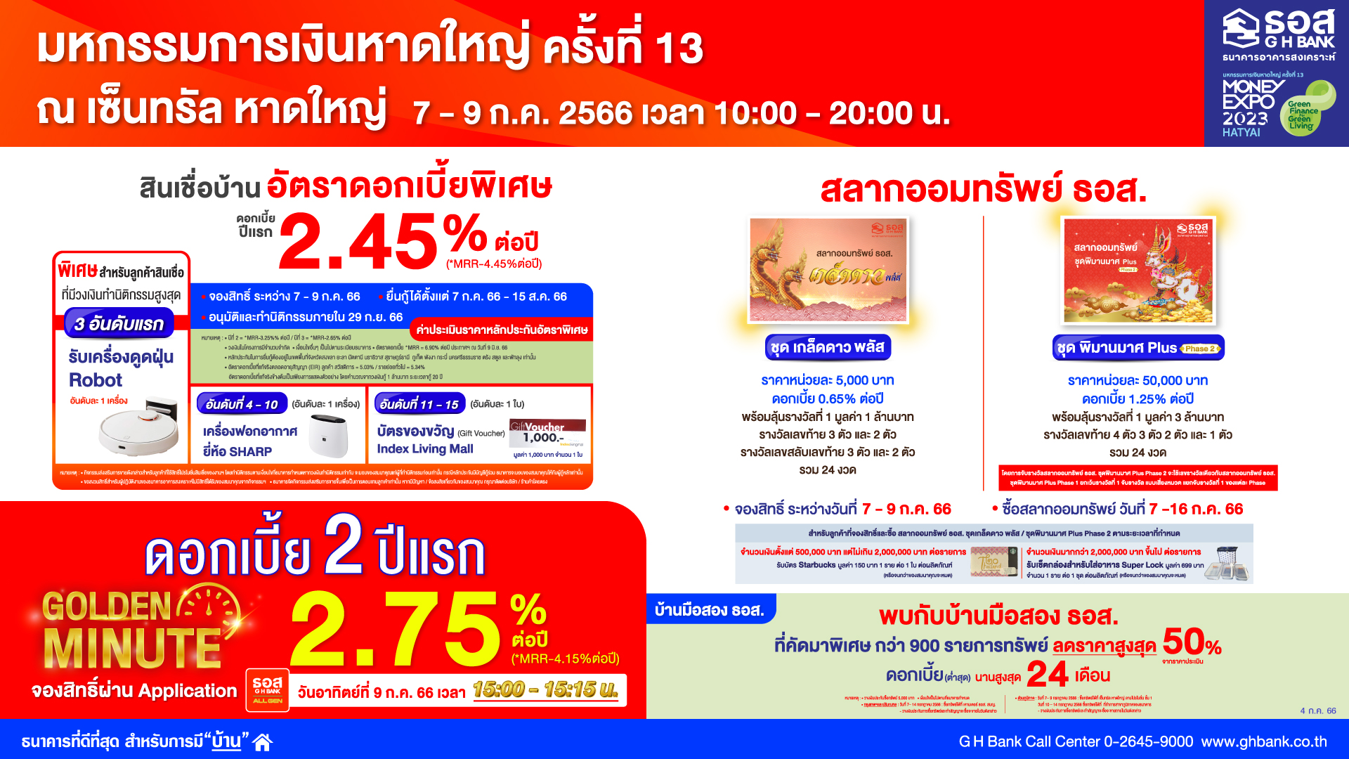 แบบที่ 2 ช่วง Golden Minute สำหรับลูกค้าที่จองสิทธิ์ดอกเบี้ยแบบที่ 1 ภายในระยะเวลาที่กำหนด สามารถลุ้นรับอัตราดอกเบี้ยพิเศษ 2 ปีแรก เท่ากับ MRR-4.15% ต่อปี (2.75%) เฉลี่ย 3 ปีแรก เพียง 3.12% เปิดจองสิทธิ์ผ่าน Mobile Application : GHB ALL GEN ในวันอาทิตย์ที่ 9 กรกฎาคม 2566 ระหว่างเวลา 15.00-15.15 น. จองก่อนได้สิทธิ์ก่อนจนกว่าจะเต็มกรอบวงเงิน