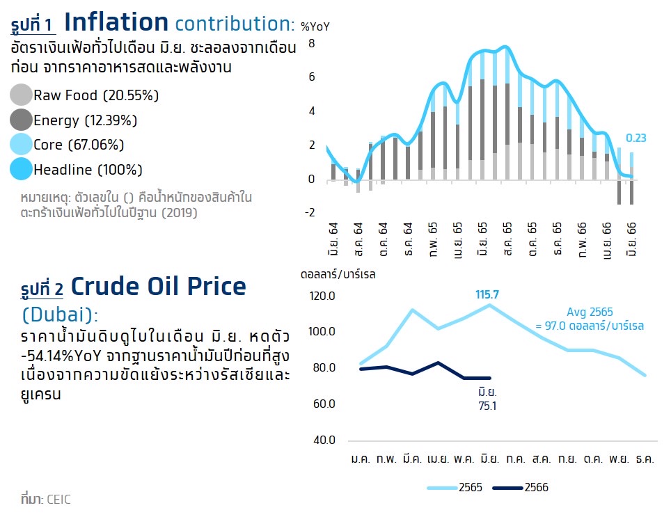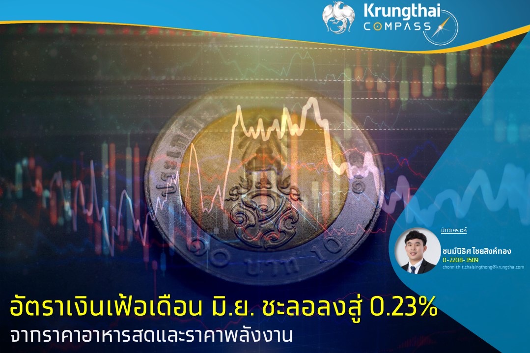 ธนาคารกรุงไทยได้วิเคราะห์ โดยอัตราเงินเฟ้อทั่วไปเดือน มิ.ย. ขยายตัว 0.23%YoY ชะลอลงจากหมวดอาหารสดตามราคาเนื้อสุกรและผักสดที่ลดลงเป็นสำคัญ ขณะที่หมวดพลังงานหดตัวจากราคาน้ำมันเชื้อเพลิงที่ปรับลดลงและผลของฐานปีก่อนที่สูงขึ้น ด้านอัตราเงินเฟ้อพื้นฐานชะลอลงที่ 1.32%YoY จากหมวดตรวจรักษาและบริการส่วนบุคคลหมวดบันเทิง การอ่าน การศึกษาฯ และหมวดยาสูบและเครื่องดื่มมีแอลกอฮอล์
