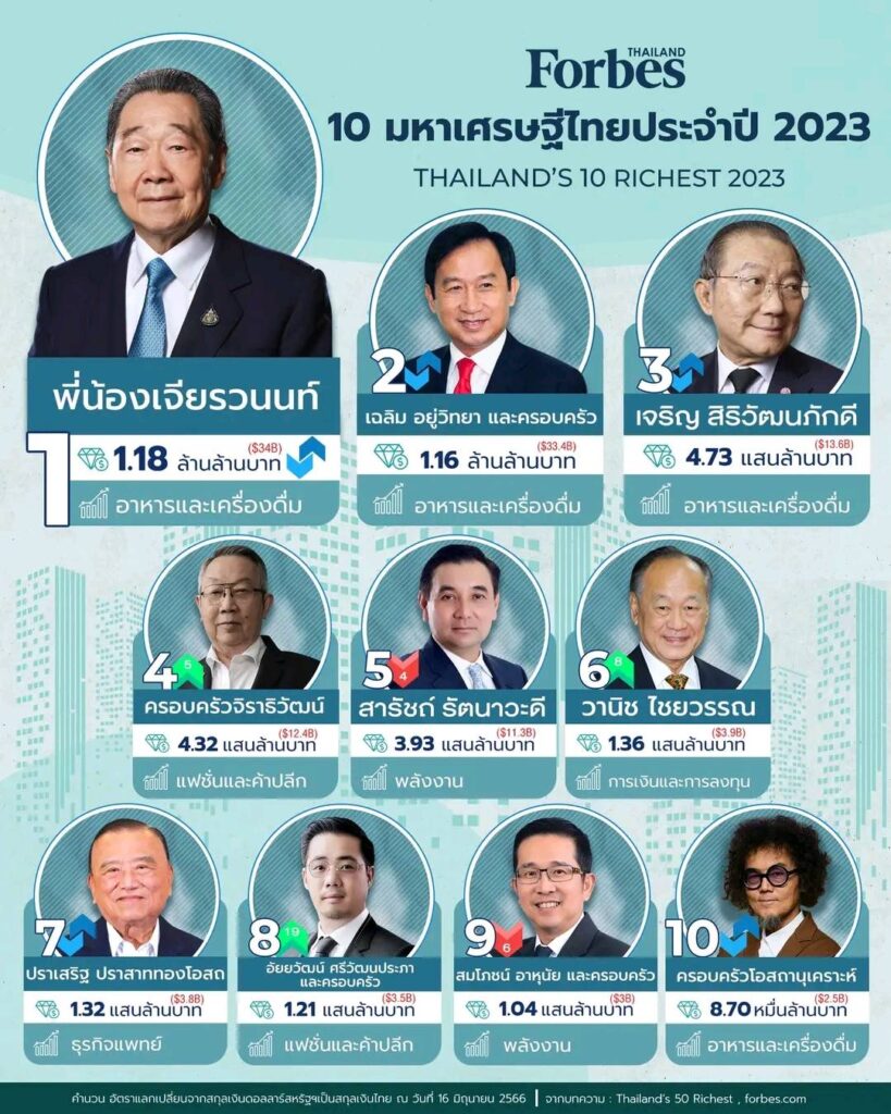 Forbes Thailand เปิดเผย 50 อันดับมหาเศรษฐีไทย ประจำปี 2566 ระบุว่า เศรษฐกิจประเทศไทยฟื้นตัวจากการกลับมาของนักท่องเที่ยว ธนาคารแห่งประเทศไทยประมาณการเติบโตปีนี้อยู่ที่ 3.6% ผลการเลือกตั้งในเดือนพฤษภาคม ที่ผ่านมา เป็นเรื่องน่าประหลาดใจยิ่งนักเมื่อพรรคก้าวไกลซึ่งเป็นที่นิยมให้หมู่คนรุ่นใหม่คว้าชัยชนะไปอย่างงดงาม