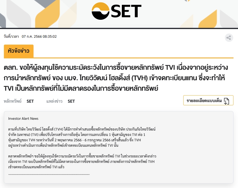 ตลาดหลักทรัพย์แห่งประเทศไทย แจ้งว่า ตามที่บมจ.ไทยวิวัฒน์ โฮลดิ้งส์ (TVH) ได้มีการทำคำเสนอซื้อหลักทรัพย์ของบมจ. ประกันภัยไทยวิวัฒน์ (TVI) เพื่อปรับโครงสร้างการถือหุ้น โดยการแลกเปลี่ยน 1 หุ้นสามัญของ TVI ต่อ 1 หุ้นสามัญของ TVH ระหว่างวันที่ 2 พฤษภาคม 2566 – 6 กรกฎาคม 2566 เสร็จสิ้นแล้ว ซึ่ง TVH อยู่ระหว่างดำเนินการเพื่อนำหลักทรัพย์เข้าจดทะเบียนแทนหลักทรัพย์ TVI นั้น