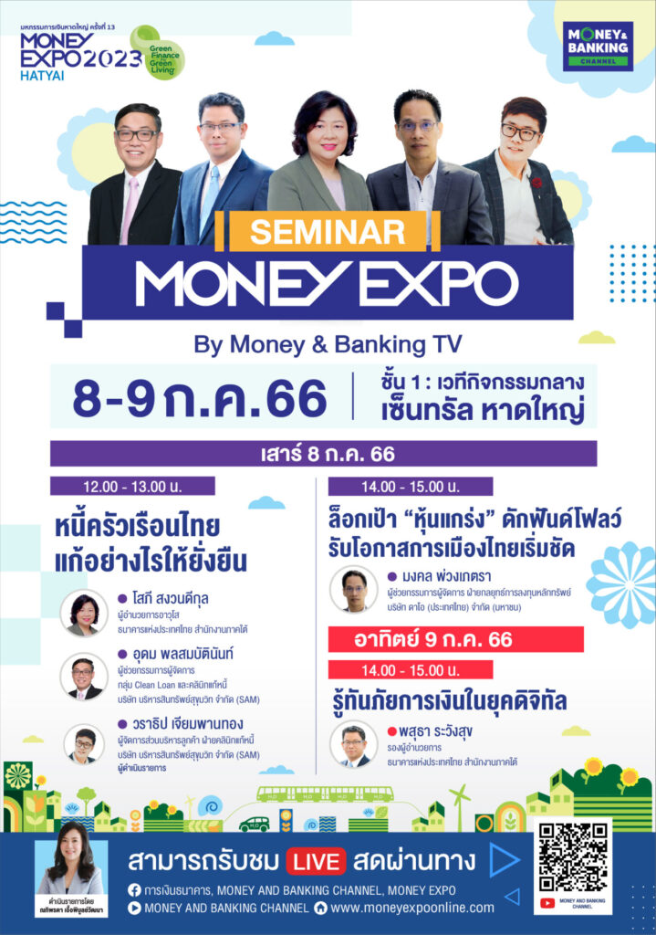 นางสาวภาคนี วิริยะรังสฤษฎ์ ประธานจัดงานร่วม งานมหกรรมการเงิน Money Expo เปิดเผยว่า งานมหกรรมการเงินหาดใหญ่ ครั้งที่ 13 MONEY EXPO 2023 HATYAI จัดขึ้นในระหว่างวันที่ 7-9 กรกฎาคม 2566 ณ หาดใหญ่ ฮอลล์ ชั้น 5 และลานโปรโมชั่น ชั้น 1 ศูนย์การค้าเซ็นทรัล หาดใหญ่ ภายใต้แนวคิด “Green Finance for Green Living การเงินสีเขียว เพื่อชีวิตสีเขียว”