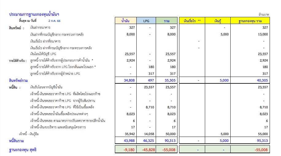 ก่อนหน้านี้ ทางสำนักงานกองทุนน้ำมันเชื้อเพลิง (สกนช.) ระบุในขณะนี้เงินไหลเข้าบัญชีน้ำมัน ในกองทุนน้ำมันฯ ขยับดีขึ้นมาก ล่าสุดวันที่ 2 ก.ค.66 กองทุนฯ ภาพรวมติดลบประมาณ 5.5 หมื่นล้านบาท แยกเป็นติดลบบัญชีน้ำมันเพียง 9,180 ล้านบาท บัญชีก๊าซหุงต้ม ติดลบสูงถึง 45,828 ล้านบาท ซึ่งหากกระทรวงการคลังจัดเก็บภาษี ไม่ว่าจะเป็นการทยอยขึ้นหรือขึ้นทีเดียว 5 บาท/ลิตร ราคาน้ำมันดีเซลก็จะไม่ขึ้นไปอีก จากปัจจุบันอยู่ที่ประมาณ 32 บาท/ลิตร แต่หากทยอยขึ้นภาษี ประกอบกับราคาน้ำมันตลาดโลกอยู่ในเกณฑ์ต่ำต่อเนื่อง ก็มีโอกาสจะลดราคาดีเซลลงมาได้.-สำนักข่าวไทย