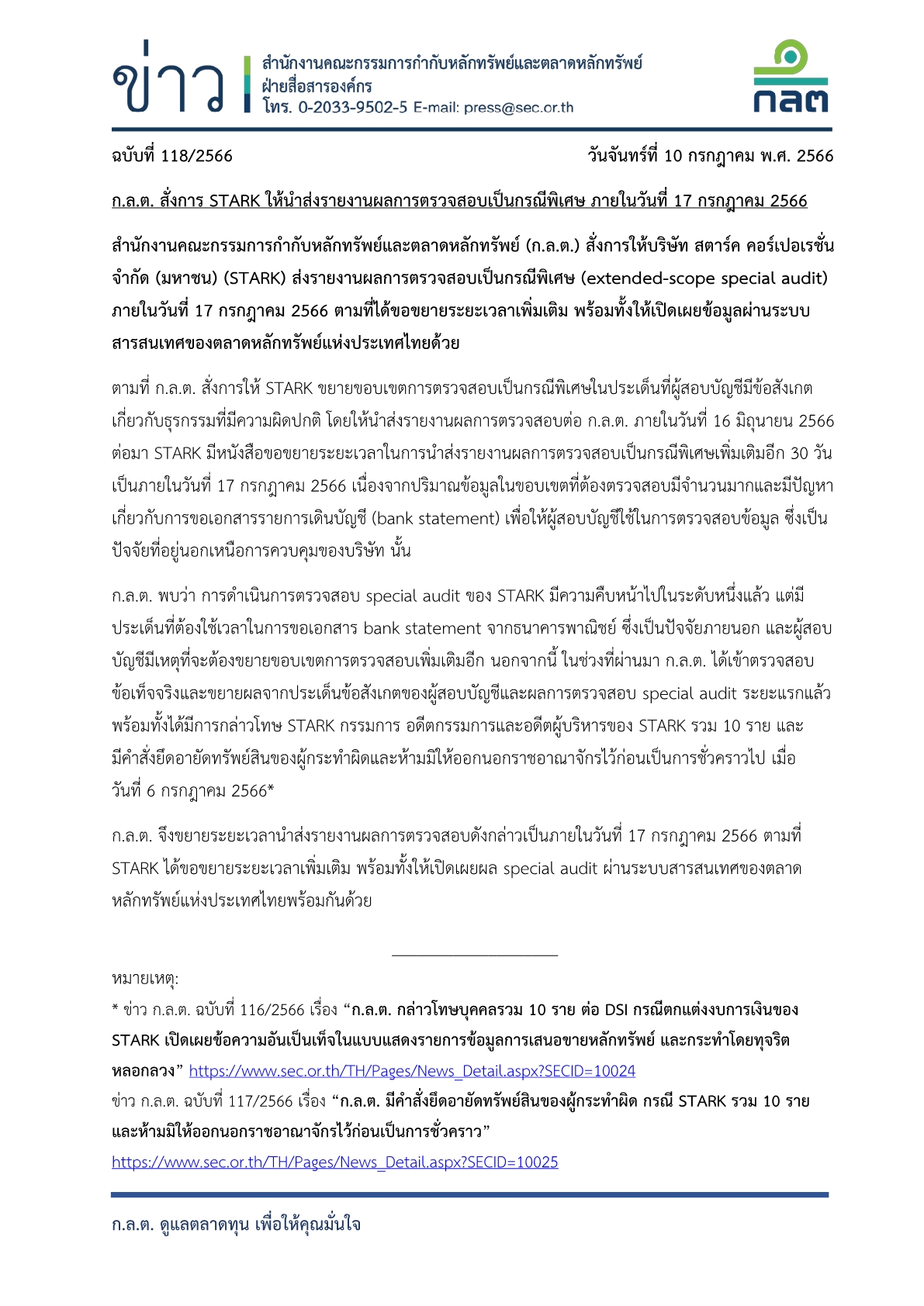 ก.ล.ต. จึงขยายระยะเวลานำส่งรายงานผลการตรวจสอบดังกล่าวเป็นภายในวันที่ 17 กรกฎาคม 2566 ตามที่ STARK ได้ขอขยายระยะเวลาเพิ่มเติม พร้อมทั้งให้เปิดเผยผล special audit ผ่านระบบสารสนเทศของตลาดหลักทรัพย์แห่งประเทศไทยพร้อมกันด้วย