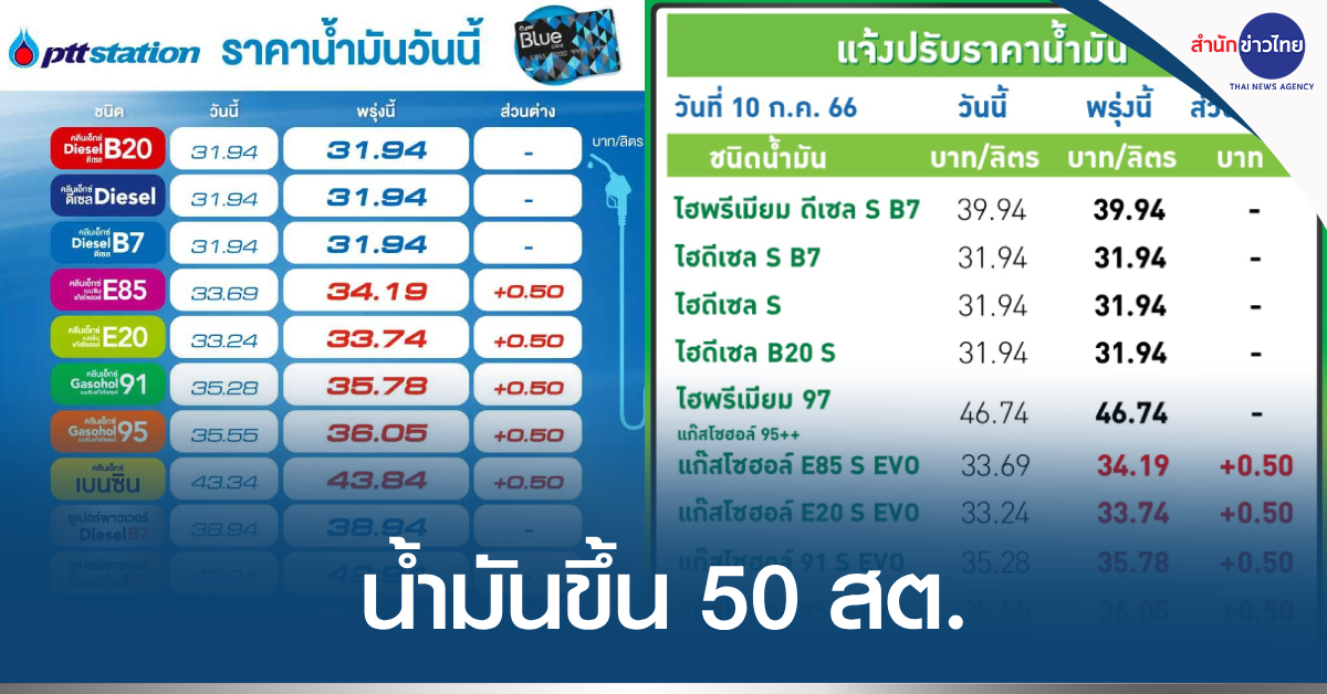 PTT Station ปรับราคาขายปลีกน้ำมันกลุ่มเบนซินและแก๊สโซฮอล์ทุกชนิดขึ้น 0.50 บาท/ลิตร ส่วน Premium GSH95 และกลุ่มดีเซลคงเดิม มีผล 11 ก.ค.66 เวลา 05.00 น. เป็นต้นไป โดยราคาขายปลีกจะเป็นดังนี้ ULG = 43.84, GSH95 = 36.05, E20 = 33.74, GSH91 = 35.78, E85 = 34.19, พรีเมี่ยม GSH95 = 42.94, HSD-B7 = 31.94, HSD-B10 = 31.94, HSD-B20 = 31.94, พรีเมี่ยมดีเซล B7 = 38.94 บาท/ลิตร โดยราคาขายปลีกข้างต้นยังไม่รวมภาษีบำรุงกรุงเทพมหานคร