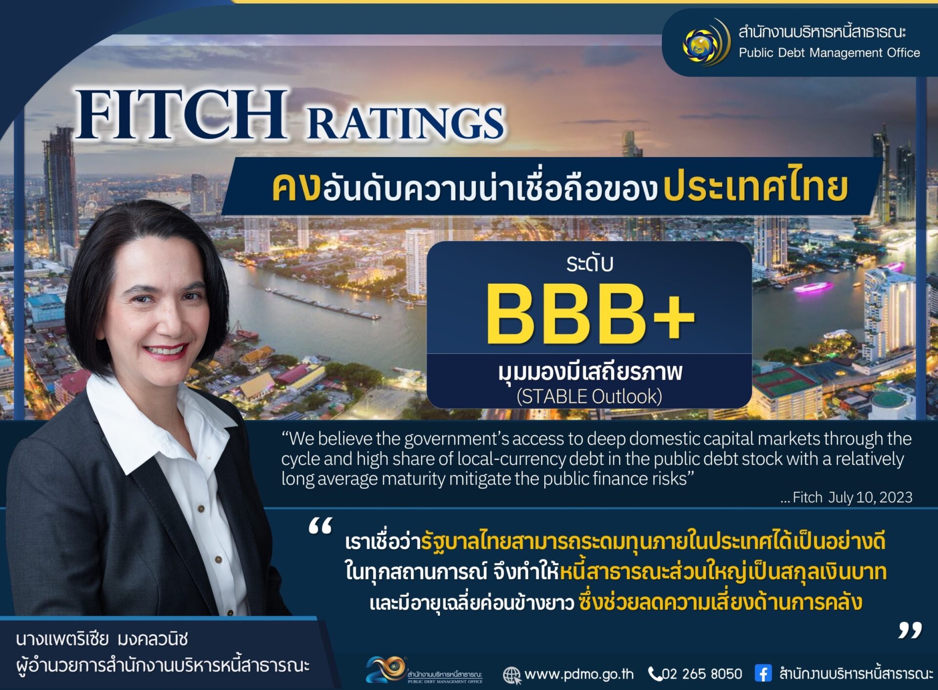 นางแพตริเซีย มงคลวนิช ผู้อำนวยการสำนักงานบริหารหนี้สาธารณะ เปิดเผยว่า เมื่อวานนี้ (10 ก.ค.) บริษัท Fitch Ratings (Fitch) ได้คงอันดับความน่าเชื่อถือของประเทศไทย (Sovereign Credit Rating) ที่ BBB+ และคงมุมมองความน่าเชื่อถือของประเทศไทย (Outlook) อยู่ในระดับมีเสถียรภาพ (Stable Outlook) โดยมีรายละเอียดดังนี้