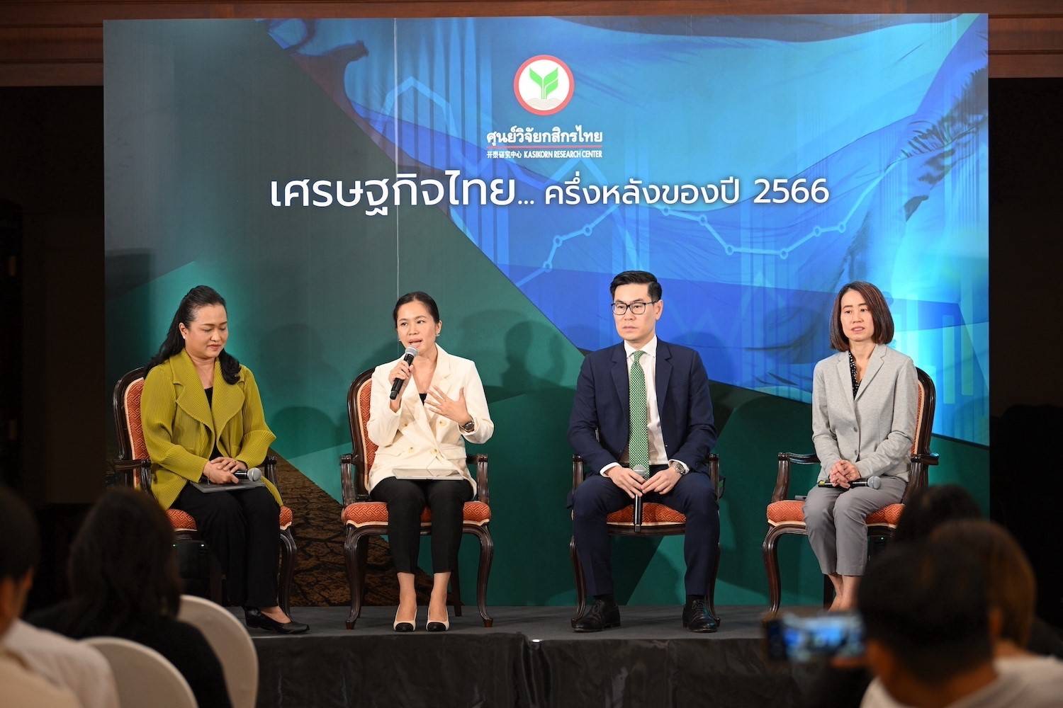 นางสาวณัฐพร ตรีรัตน์ศิริกุล รองกรรมการผู้จัดการ บริษัท ศูนย์วิจัยกสิกรไทย จำกัด เปิดเผยว่า ศูนย์วิจัยฯ ได้คงประมาณการอัตราการขยายตัวทางเศรษฐกิจ (จีดีพี) อยู่ที่ 3.7% โดยเศรษฐกิจในช่วงครึ่งหลังมีแนวโน้มขยายตัวดีกว่าครึ่งแรกของปีอยู่ที่ 4.3% จากครึ่งแรกของปีอยู่ที่ 3.0% ซึ่งอานิสงส์การเติบโตยังมาจากภาคการท่องเที่ยวที่ยังขยายตัวคาดจำนวนอยู่ที่ 28.5 ล้านคนและการบริโภคเอกชนที่ปรับดีขึ้นจาก 3.3% เป็น 3.8% โดยในไตรมาสที่1/2566 ตัวเลขจริงขยายตัวกว่า 5% จากการใช้จ่ายที่ขยายตัวได้ตามภาคการท่องเที่ยวและ มองไปข้างหน้าคาดว่าจะขยายตัวเฉลี่ย 3% เนื่องจากมีประเด็นเรื่องอัตราดอกเบี้ยที่ยังทยอยปรับขึ้น และหนี้ครัวเรือนที่อยู่ในระดับสูงและคุมเข้มมาตรการของธนาคารแห่งประเทศไทย (ธปท.) รวมถึงมาตรการกระตุ้นเศรษฐกิจของรัฐบาลใหม่จะออกมาทันหรือไม่ ซึ่งเป็นประเด็นกดดันการบริโภค