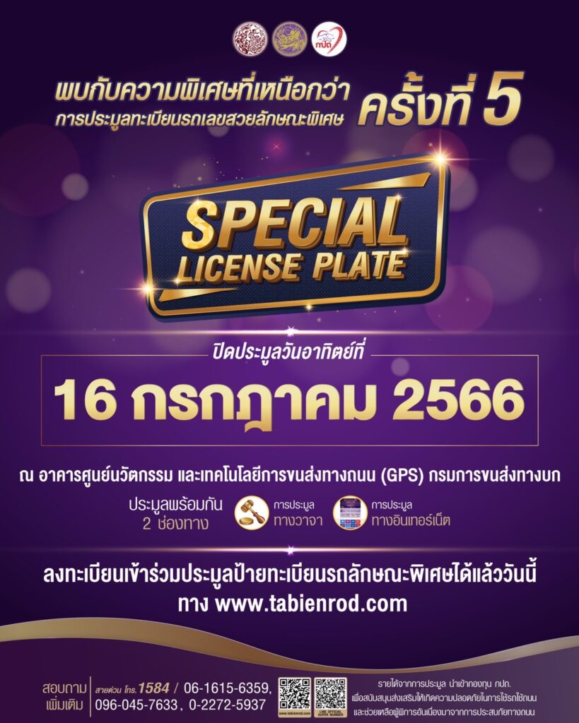 กรมการขนส่งทางบก ประชาสัมพันธ์เชิญชวนผู้สนใจเข้าร่วมการประมูลหมายเลขทะเบียนรถที่มีลักษณะพิเศษ สำหรับรถยนต์นั่งส่วนบุคคลไม่เกินเจ็ดคน ครั้งที่ 5 ในวันที่ 16 กรกฎาคม 2566 ณ อาคารศูนย์นวัตกรรมและเทคโนโลยีการขนส่งทางถนน (GPS) กรมการขนส่งทางบก โดยสามารถลงทะเบียนและเสนอราคาผ่านทางเว็บไซต์ www.tabienrod.com ได้ตั้งแต่วันนี้เป็นต้นไป เพื่อนำรายได้จากการประมูลไปสนับสนุนกิจกรรมเสริมสร้างความปลอดภัยในการใช้รถใช้ถนน รวมทั้งสนับสนุนเป็นค่าอุปกรณ์ช่วยเหลือผู้พิการที่ประสบภัยจากการใช้รถใช้ถนน