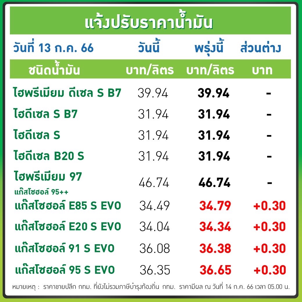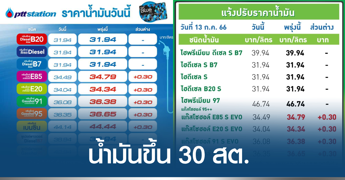 PTT Station ปรับราคาขายปลีกน้ำมันกลุ่มเบนซินและแก๊สโซฮอล์ทุกชนิดขึ้น 0.30 บาท/ลิตร ส่วน Premium GSH95 และกลุ่มดีเซลคงเดิม มีผล 14 ก.ค.66 เวลา 05.00 น. เป็นต้นไป โดยราคาขายปลีกจะเป็นดังนี้ ULG = 44.44, GSH95 = 36.65, E20 = 34.34, GSH91 = 36.38, E85 = 34.79, พรีเมี่ยม GSH95 = 42.94, HSD-B7 = 31.94, HSD-B10 = 31.94, HSD-B20 = 31.94, พรีเมี่ยมดีเซล B7 = 38.94 บาท/ลิตร โดยราคาขายปลีกข้างต้นยังไม่รวมภาษีบำรุงกรุงเทพมหานคร