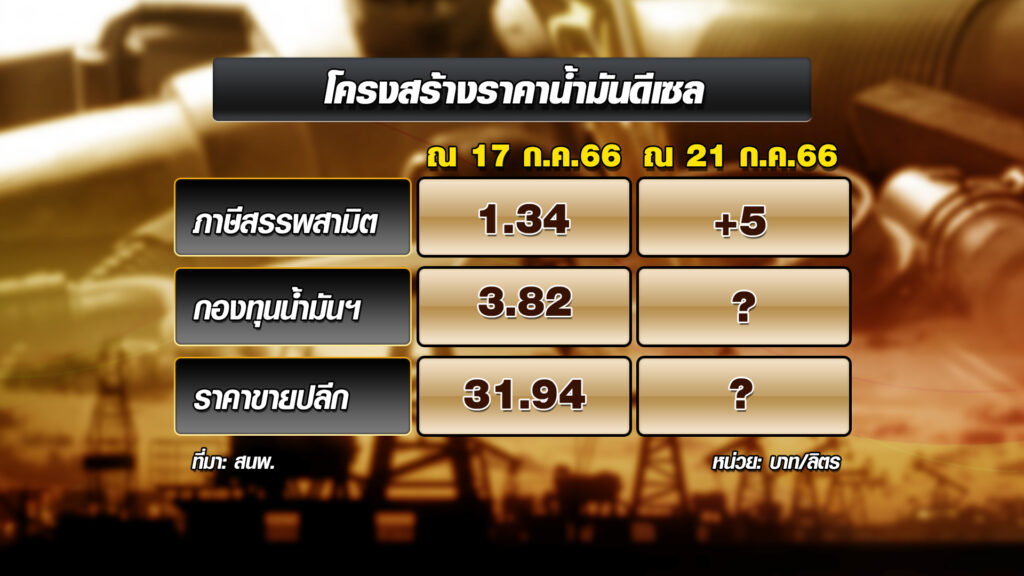 ส่วนโครงสร้างราคาน้ำมันดีเซลที่ราคาปัจจุบันที่ประมาณ 32 บาท/ลิตร มีการเก็บเงินกองทุน น้ำมันฯ 3.82บาทต่อลิตร ดังนั้น หากรัฐกลับมาเก็บภาษี 5 บาท ในวันที่ 21 ก.ค. โดยหาก กบน.ใช้แนวทางไม่ขึ้นราคาดีเซลด้วย การลดการจัดเก็บเงินกองทุนทั้งหมด 3.82 บาท ก็ยังไม่เพียงพอสำหรับการตรึงราคาดีเซล 32 บาท/ลิตร อาจต้องขยับราคาดีเซลขึ้นบ้าง ก็ต้องรอดูว่า กบน.จะตัดสินใจอย่างไร จากที่ก่อนหน้านี้ สกนช.ระบุจะบริหารจัดการโดยไม่ขึ้นราคาดีเซล ในขณะเดียวกันหากจำเป็นต้องขึ้น ที่ผ่านมา กบน.ก็จะใช้แนวทางขึ้น-ลง ครั้งละ 50 สตางค์ /ลิตร เพื่อไม่ให้กระทบผู้บริโภคมากเกินไป