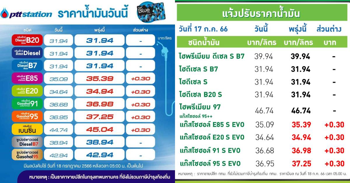 โดยราคาขายปลีกจะเป็นดังนี้ ULG = 45.04, GSH95 = 37.25, E20 = 34.94, GSH91 = 36.98, E85 = 35.39, พรีเมี่ยม GSH95 = 42.94, HSD-B7 = 31.94, HSD-B10 = 31.94, HSD-B20 = 31.94, พรีเมี่ยมดีเซล B7 = 38.94 บาทต่อลิตร โดยราคาขายปลีกข้างต้นยังไม่รวมภาษีบำรุงกรุงเทพมหานคร.-สำนักข่าวไทย
