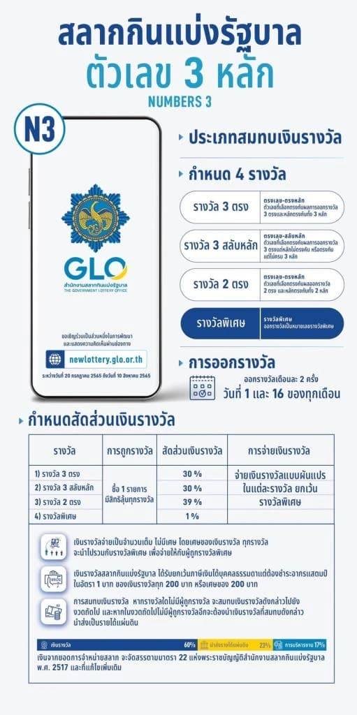 การจัดสรรเงินรางวัล กฎหมายกำหนดให้สัดส่วนร้อยละ 60 ของยอดขายใช้เป็นเงินรางวัล จัดสรรไม่น้อยกว่าร้อยละ 23 เป็นรายได้แผ่นดิน และเงินไม่เกินกว่าร้อยละ 17 เป็นค่าใช้จ่ายในการบริหารงาน รัฐบาล หวังว่าการออกรางวัลเลขท้าย 2-3 ตัว ช่วยแก้ไขปัญหาการขายสลากฯ เกินราคา เมื่อขายผ่านแอปพลิเคชันเป๋าตัง และเพิ่มทางเลือกให้ประชาชนซื้อสลากแบบถูกกฎหมาย แทนการซื้อหวยใต้ดิน ผู้ซื้อสลากสามารถเลือกตัวเลขได้ตามความต้องการ มีรางวัลแจ็คพอตให้ลุ้นเพิ่มเติม และได้รับรางวัลอย่างแน่นอน ส่วนสลาก L6 แบบดิจิทัล จะไม่มีการพิมพ์สลากฯ และไม่มีการสแกนภาพสลากฯ จึงแตกต่างจากสลากฯ ที่ใช้อยู่ในปัจจุบัน.-สำนักข่าวไทย