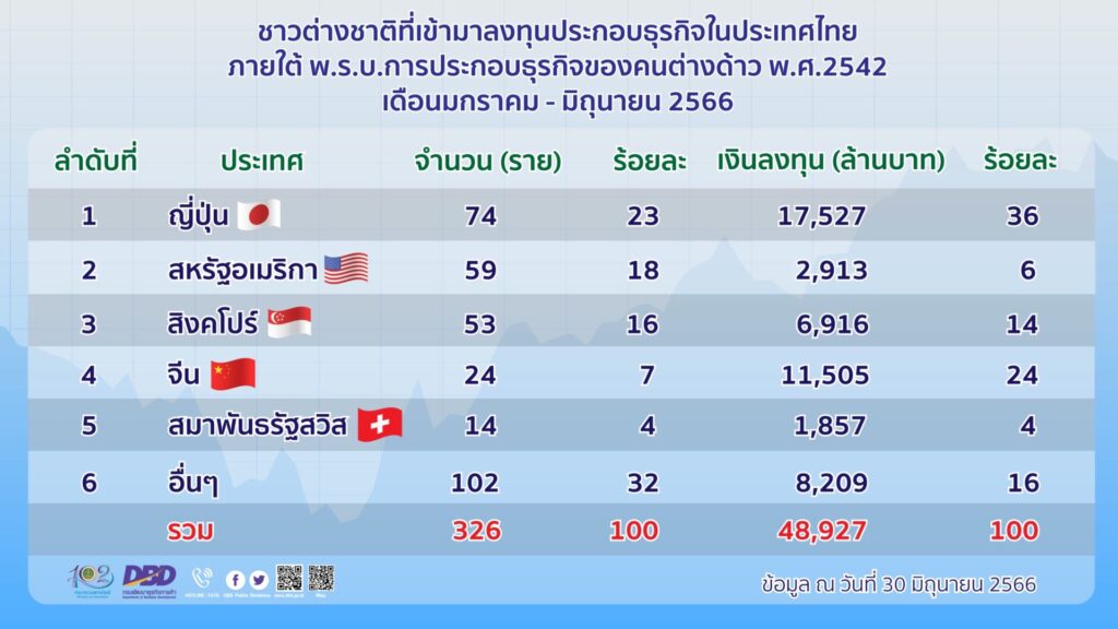นายทศพล ทังสุบุตร อธิบดีกรมพัฒนาธุรกิจการค้าและในฐานะเลขานุการคณะกรรมการการประกอบธุรกิจของคนต่างด้าว เปิดเผยว่า “ครึ่งปีแรกของปี 2566 (มกราคม – มิถุนายน) มีการอนุญาตให้คนต่างชาติเข้ามาลงทุนประกอบธุรกิจในประเทศไทย ภายใต้พระราชบัญญัติการประกอบธุรกิจของคนต่างด้าว พ.ศ. 2542 จำนวน 326 ราย เป็นการลงทุนผ่านช่องทางการขอรับใบอนุญาตประกอบธุรกิจของคนต่างด้าว จำนวน 102 ราย และการขอหนังสือรับรองการประกอบธุรกิจของคนต่างด้าว จำนวน 224 ราย เม็ดเงินลงทุนทั้งสิ้น 48,927 ล้านบาท จ้างงานคนไทย 3,222 คน