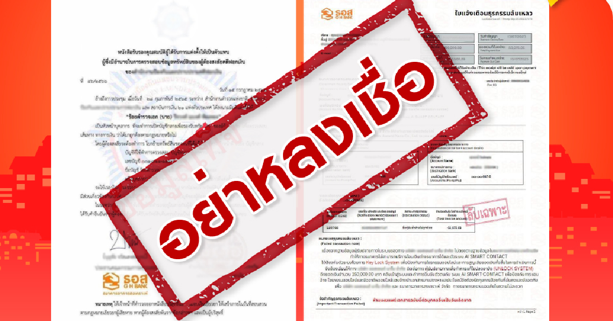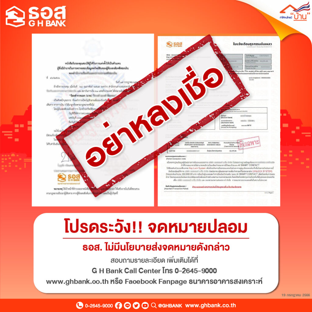 กรุงเทพฯ 19 ก.ค. – ธอส. เตือนภัย! มิจฉาชีพส่งจดหมายปลอม แอบอ้างใช้โลโก้ธนาคารโดยไม่ได้รับอนุญาต เพื่อหลอกให้ลูกค้าโอนเงิน วอนลูกค้าอย่าหลงเชื่อข้อมูลดังกล่าว
