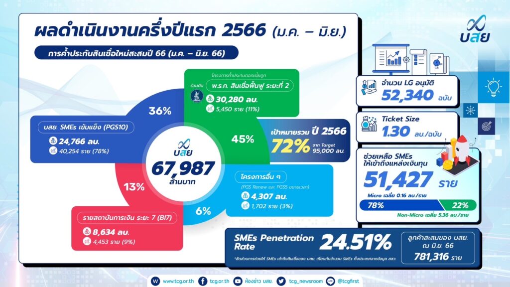 ด้านผลดำเนินงานอนุมัติค้ำประกันสินเชื่อ 6 เดือน (ม.ค.-มิ.ย. 2566) อนุมัติวงเงินรวม 67,987 ล้านบาท ช่วย SMEs ได้สินเชื่อ 51,427 ราย สร้างผลประโยชน์ทางเศรษฐกิจ 280,786 ล้านบาท สร้างสินเชื่อสู่ระบบ 76,049 ล้านบาทรักษาการจ้างงานรวม 493,552 ตำแหน่ง ผ่านโครงการค้ำประกันสินเชื่อ 4 โครงการ ได้แก่