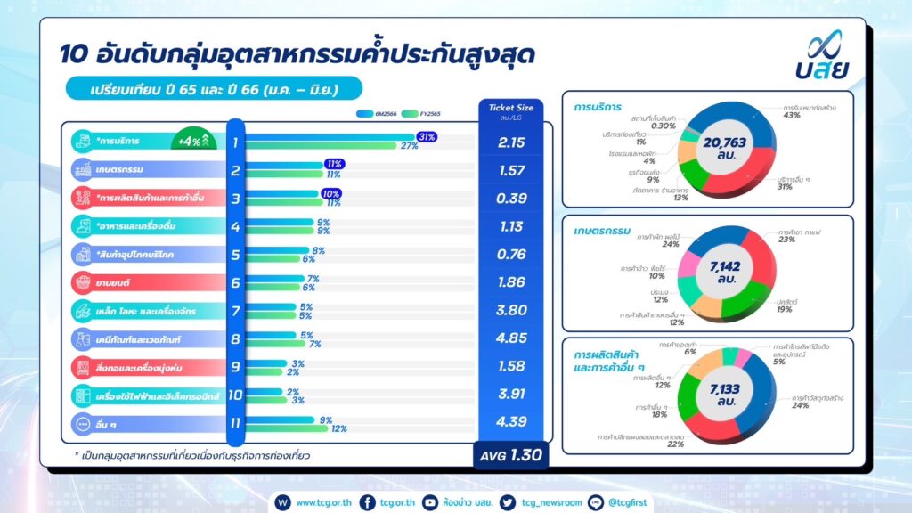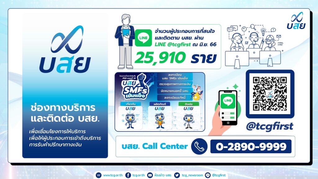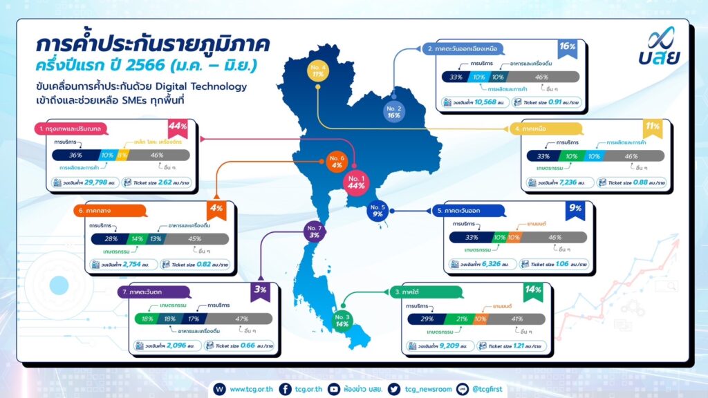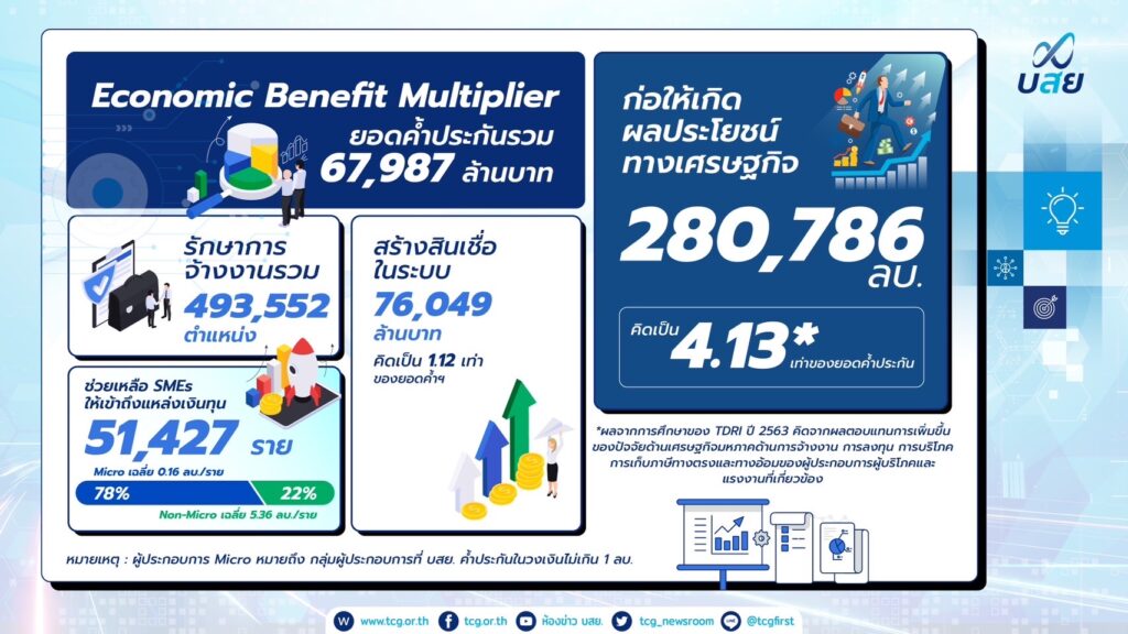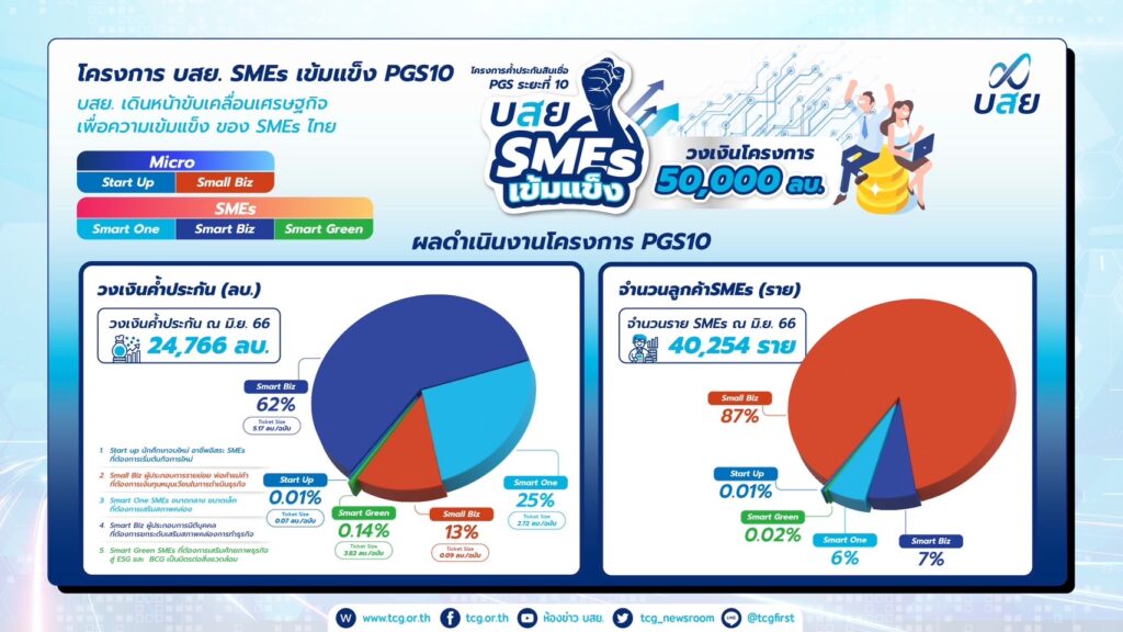 นายสิทธิกร ดิเรกสุนทร กรรมการและผู้จัดการทั่วไป บรรษัทประกันสินเชื่ออุตสาหกรรมขนาดย่อม (บสย.) เปิดเผยผลดำเนินงาน บสย. 6 เดือนแรกของปี 2566 ระหว่างเดือน มกราคม – มิถุนายน ประสบผลสำเร็จตามเป้าทั้งด้านค้ำประกันสินเชื่อ เติมสภาพคล่องทางการเงินต่อยอดธุรกิจ SMEs การแก้หนี้ ปรับปรุงโครงสร้างหนี้ ผ่านมาตรการ“บสย. พร้อมช่วย” การให้คำปรึกษาทางการเงิน SMEs (บสย. F.A.Center) การขับเคลื่อนองค์กรด้วยดิจิทัล Digital Technology และการเพิ่มจำนวนผู้ใช้งานบน Line @tcgfirst ช่วง 6 เดือนแรก อนุมัติวงเงิน 67,987 ล้านบาท เติมสภาพคล่อง SMEs ได้สินเชื่อ 51,427 ราย สร้างผลประโยชน์ทางเศรษฐกิจ 280,786 ล้านบาท สร้างสินเชื่อสู่ระบบ76,049 ล้านบาท รักษาการจ้างงานรวม 493,552 ตำแหน่ง พร้อมเดินหน้าผลักดันเป้าหมายค้ำประกันสินเชื่อในปีนี้150,000 ล้านบาทในสิ้นปี 66 นี้