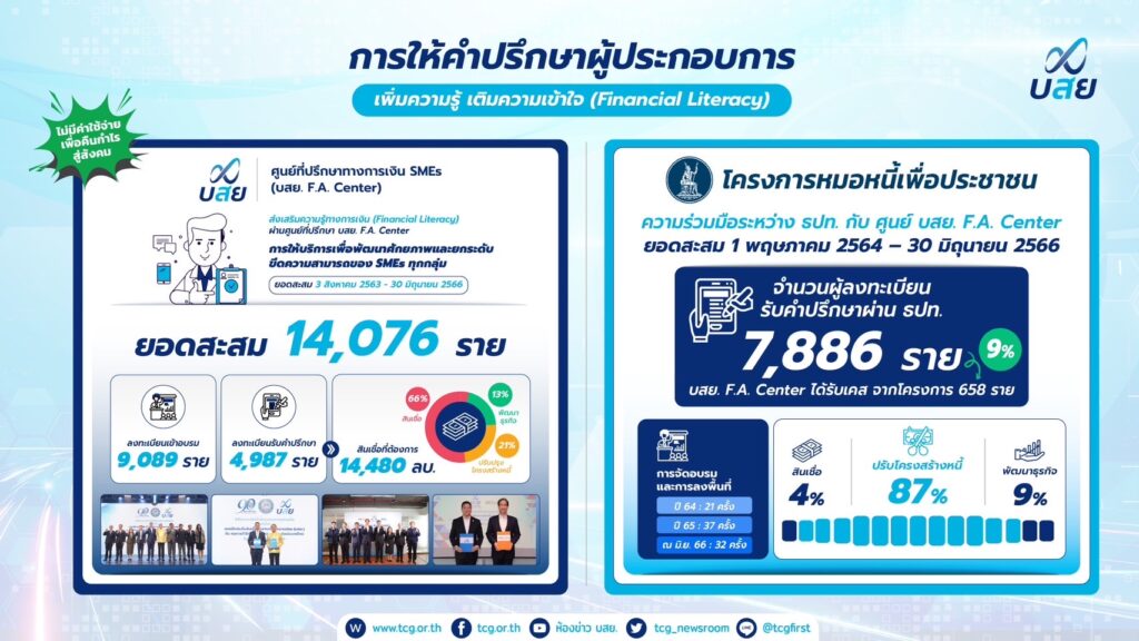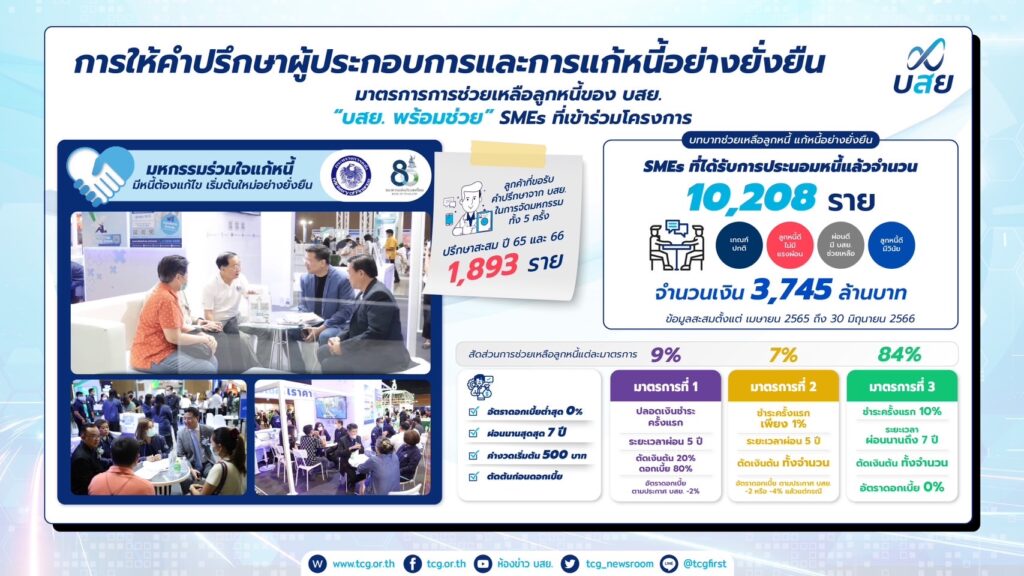 นอกจากนี้ บสย. ยังประสบความสำเร็จในการให้คำปรึกษาทางการเงิน SMEs (บสย. F.A. Center) จำนวนผู้ใช้บริการลงทะเบียนขอรับคำปรึกษาและเข้าอบรมมากกว่า 14,076 ราย ขณะที่โครงการช่วยลูกหนี้ “บสย. พร้อมช่วย” มาตรการเชิงรุก เพื่อเพิ่มประสิทธิภาพการช่วยเหลือลูกหนี้แก้หนี้ยั่งยืนได้รับผลสำเร็จดีเยี่ยม โดยสามารถช่วยเหลือลูกหนี้ ผ่านโครงการประนอมหนี้ ด้วยการปรับปรุงโครงสร้างหนี้ ผ่านมาตรการ 3 สี ม่วง เหลือง เขียว “ผ่อนน้อยเบาแรง” ได้มากถึง 10,208 ราย คิดเป็นวงเงิน 3,745 ล้านบาท โดยมีมาตรการผ่อนน้อย เบาแรง ชำระครั้งแรก 10% ผ่อนนาน 7 ปี ตัดเงินต้นทั้งจำนวน ดอกเบี้ย 0% มีสัดส่วนสูงถึง 84% มีผู้ใช้บริการสูงสุด