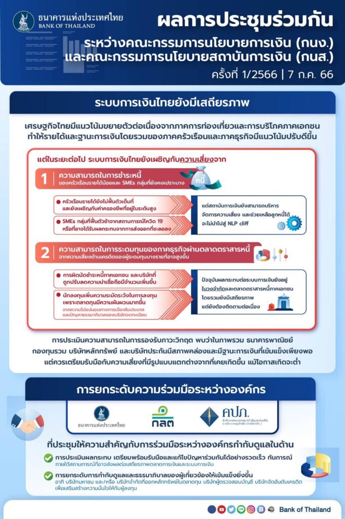 ธนาคารแห่งประเทศไทย (ธปท.) เปิดเผยผลการประชุมร่วมกันระหว่างคณะกรรมการนโยบายการเงิน (กนง.) และคณะกรรมการนโยบายสถาบันการเงิน (กนส.) ในวันที่ 7 กรกฎาคม 2566 เพื่อติดตามและประเมินเสถียรภาพระบบการเงินไทย โดยมีประเด็นสำคัญได้แก่ระบบการเงินไทยปัจจุบันยังมีเสถียรภาพ แต่ยังเผชิญกับความเสี่ยงที่อาจสูงขึ้นในระยะต่อไปจาก (1) ความสามารถในการชำระหนี้ของครัวเรือนและธุรกิจขนาดกลางและขนาดย่อม (SMEs) โดยเฉพาะครัวเรือนที่มีรายได้น้อยและ SMEs ในภาคการผลิตและการค้าที่อาจได้รับผลกระทบจากการชะลอตัวของเศรษฐกิจโลก และ (2) ความสามารถในการระดมทุนของภาคธุรกิจผ่านตลาดตราสารหนี้ จากความเสี่ยงด้านเครดิตของผู้ระดมทุนบางรายที่อาจสูงขึ้น