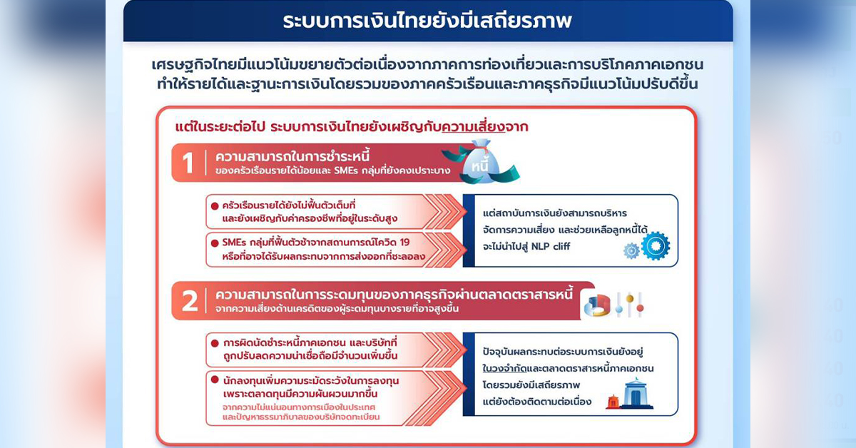 เศรษฐกิจไทยมีแนวโน้มขยายตัวต่อเนื่องจากภาคการท่องเที่ยวและการบริโภคภาคเอกชนส่งผลให้รายได้และฐานะการเงินโดยรวมของภาคครัวเรือนและภาคธุรกิจมีแนวโน้มปรับดีขึ้น อย่างไรก็ดี ครัวเรือนบางส่วนยังเปราะบางจากรายได้ที่ยังไม่ฟื้นตัวเต็มที่และค่าครองชีพที่สูงขึ้น รวมถึงยังต้องติดตามฐานะการเงินของ SMEs ในกลุ่มที่ฟื้นตัวช้าจากช่วงสถานการณ์โควิด 19 และกลุ่มที่อาจได้รับผลกระทบจากการส่งออกที่ชะลอลงตามเศรษฐกิจโลก โดยที่ประชุมประเมินว่า แม้ความเปราะบางของภาคครัวเรือนและ SMEs ดังกล่าวอาจส่งผลให้คุณภาพสินเชื่อบางกลุ่มมีแนวโน้มด้อยลงบ้าง แต่สถาบันการเงินสามารถบริหารจัดการหรือดำเนินมาตรการปรับโครงสร้างหนี้เพื่อช่วยเหลือลูกหนี้ได้ และจะไม่นำไปสู่หนี้เสียที่เพิ่มสูงขึ้นแบบก้าวกระโดด (NPL cliff)