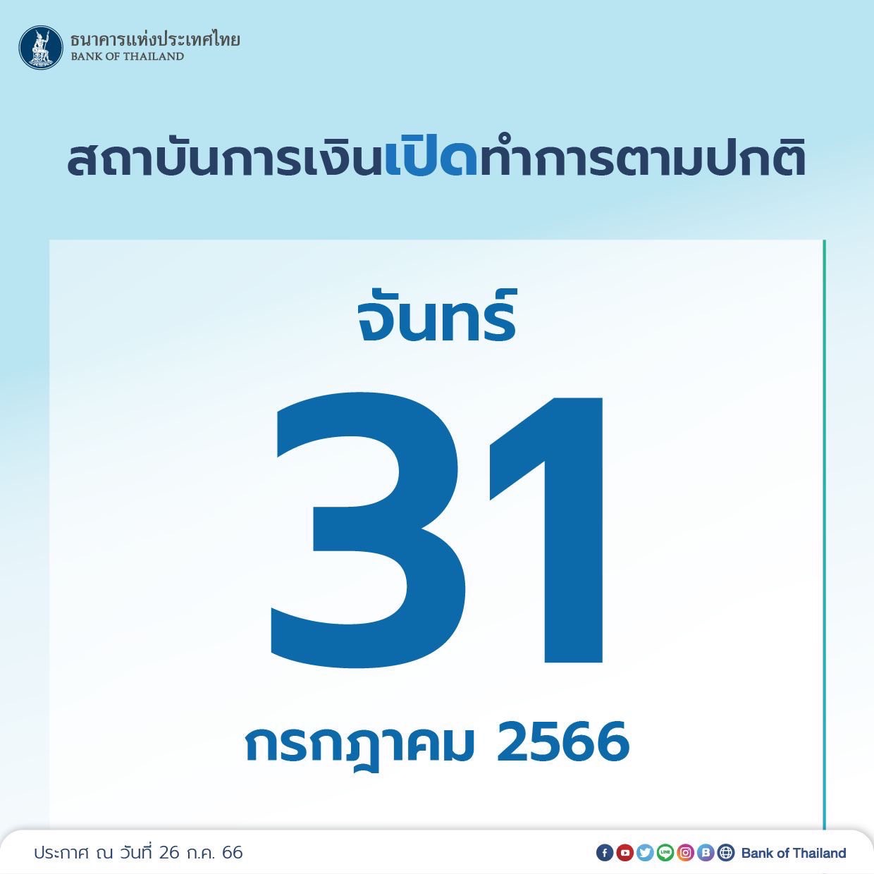 กรุงเทพฯ 26 ก.ค.- ธปท.ให้สถาบันการเงิน-สถาบันการเงินเฉพาะกิจ เปิดทำการปกติวันที่ 31 ก.ค.66 หลังครม.ประกาศเป็นวันหยุดพิเศษ