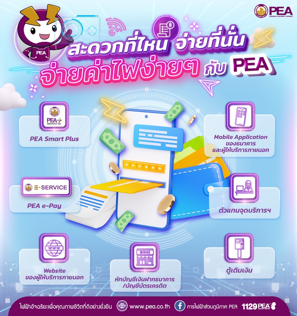 ทั้งนี้ ประชาชนผู้ใช้ไฟฟ้าสามารถสอบถามข้อมูลเพิ่มเติมได้ที่ 1129 PEA Contact Center ตลอด 24 ชั่วโมง