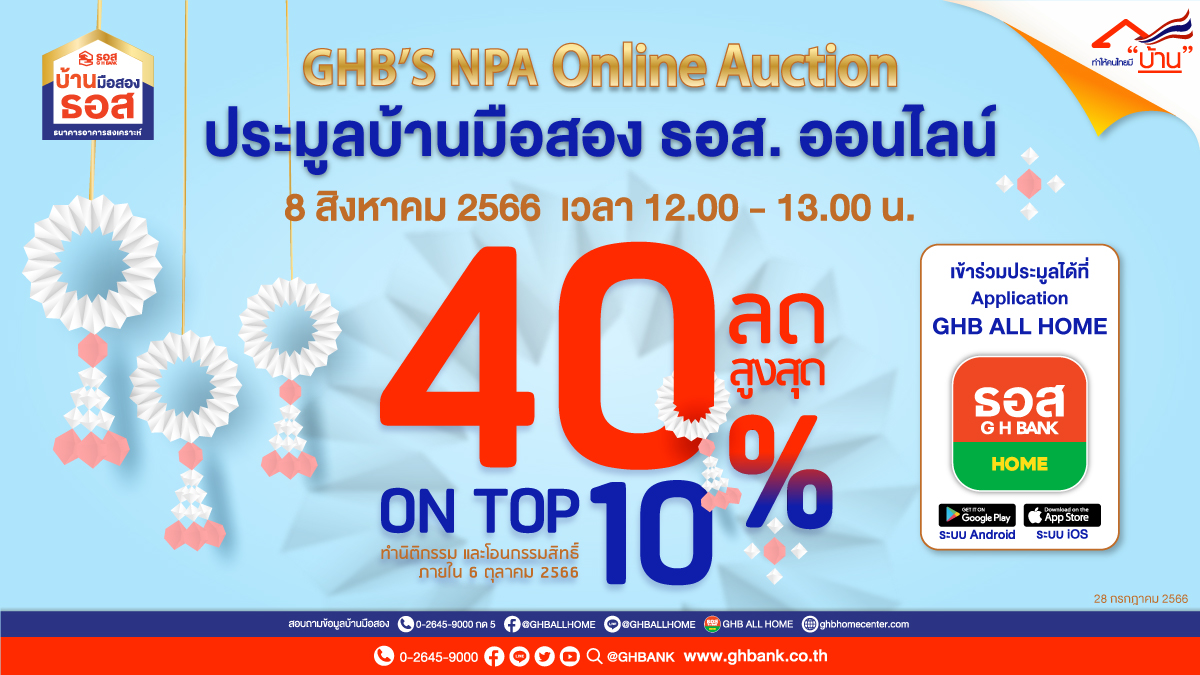 กทม. 28 ก.ค. – ธอส. จัดงานประมูลบ้านมือสองออนไลน์ : 8.8 GHB’s NPA Online Auction จัดทรัพย์เด่นกว่า 900 รายการทั่วประเทศ พร้อมส่วนลดสูงสุดถึง 40% และ On Top อีก 10% วันอังคารที่ 8 สิงหาคม 2566 วันเดียวเท่านั้น!