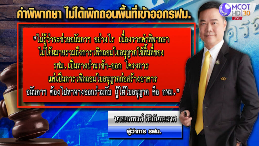 คำพิพากษาของศาลปกครองสูงสุดระบุว่าที่ดินของรฟม.จะนำมาให้เอกชนทำโครงการไม่ได้ทำให้หน่วยงานของรัฐซึ่งก็คือกรุงเทพมหานครออกใบอนุญาตก่อสร้างให้ไม่ได้ด้วยโดยการออกใบอนุญาตที่เกิดขึ้นมาแล้วจึงผิดกฎหมาย