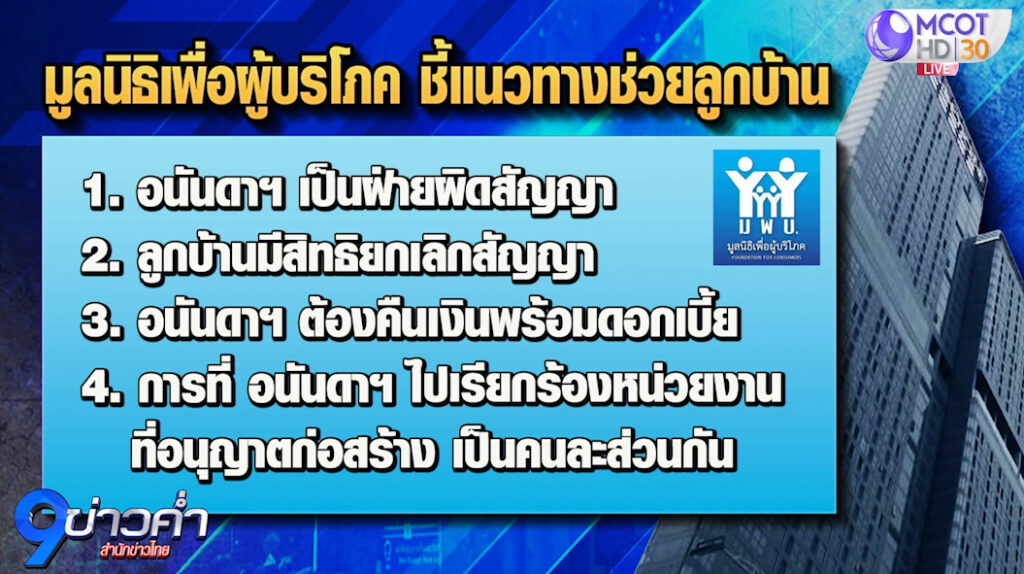ส่วนนายเฉลิมพงษ์ กลับดี หัวหน้าศูนย์ทนายความเพื่อการคุ้มครองผู้บริโภค กล่าวว่า กรณีนี้ถือว่าผู้ประกอบการเป็นฝ่ายผิดสัญญา ผู้บริโภคซื้อห้องแล้วอยู่อาศัยไม่ได้ตลอดไปตามวัตถุประสงค์ ผู้บริโภคที่ได้รับความเดือดร้อนมีสิทธิยกเลิกสัญญา และขอให้บริษัทคืนเงินทั้งหมดพร้อมดอกเบี้ย ซึ่งมูลนิธิฯ จะช่วยเหลือในเรื่องการดำเนินคดีกับบริษัทที่เป็นเจ้าของโครงการ ผู้บริโภคสามารถร้องเรียนมาที่มูลนิธิเพื่อผู้บริโภค ผ่านช่องทางการรับเรื่องร้องเรียนต่างๆ
