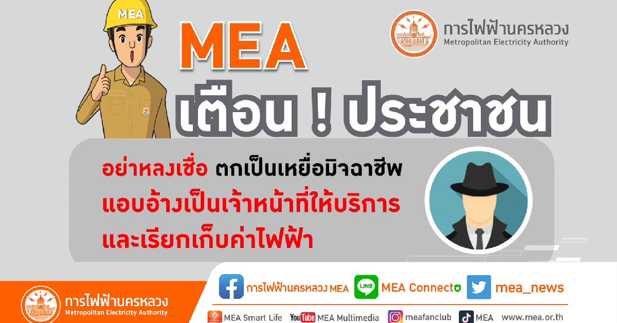 MEA หรือการไฟฟ้านครหลวง เตือนผู้ใช้ไฟฟ้าให้ระมัดระวังกลุ่มมิจฉาชีพแอบอ้างเป็นพนักงานของ MEA โทรแจ้งเตือนตัดไฟฟ้า และให้ผู้ใช้ไฟฟ้าโอนเงินเพื่อชำระค่าไฟฟ้า มิเช่นนั้นจะทำการตัดไฟนั้น MEA ยืนยันไม่มีบริการให้พนักงาน MEA โทรหาผู้ใช้ไฟฟ้าดังกล่าว