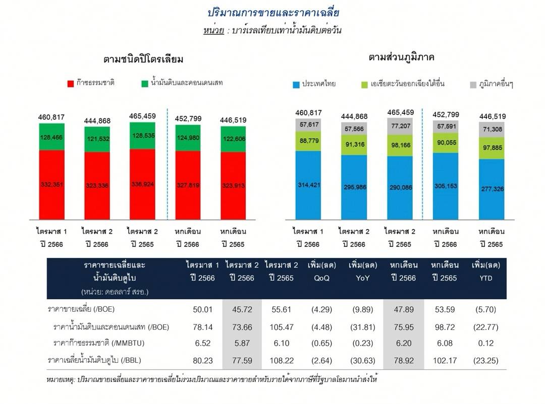 สำหรับผลประกอบการในรอบ 6 เดือนแรกของปี 2566 ปตท.สผ. มีรายได้รวม 4,359 ล้านดอลลาร์สหรัฐ (สรอ.) (เทียบเท่า 148,932 ล้านบาท) โดยปีนี้มีปริมาณขายปิโตรเลียมเฉลี่ยอยู่ที่ 452,799 บาร์เรลเทียบเท่าน้ำมันดิบต่อวัน เพิ่มขึ้นเล็กน้อยจาก 446,519 บาร์เรลเทียบเท่าน้ำมันดิบต่อวัน ในช่วงครึ่งแรกของปี 2565 ซึ่งส่วนใหญ่มาจากการผลิตปิโตรเลียมในประเทศ ได้แก่ โครงการจี 1/61 โครงการอาทิตย์ และโครงการพื้นที่พัฒนาร่วมไทย-มาเลเซีย (MTJDA) ส่วนราคาขายผลิตภัณฑ์ปรับตัวลดลงตามราคาน้ำมันดิบในตลาดโลก ในช่วงครึ่งปีแรก บริษัทจึงมีกำไรสุทธิ 1,180 ล้านดอลลาร์ สรอ. (เทียบเท่า 40,321 ล้านบาท) และยังคงรักษาต้นทุนต่อหน่วย (Unit cost) ไว้ที่ 26.24 ดอลลาร์ สรอ. ต่อบาร์เรลเทียบเท่าน้ำมันดิบ โดยมีอัตรากำไรก่อนดอกเบี้ย ภาษี และค่าเสื่อมราคาที่ร้อยละ 75