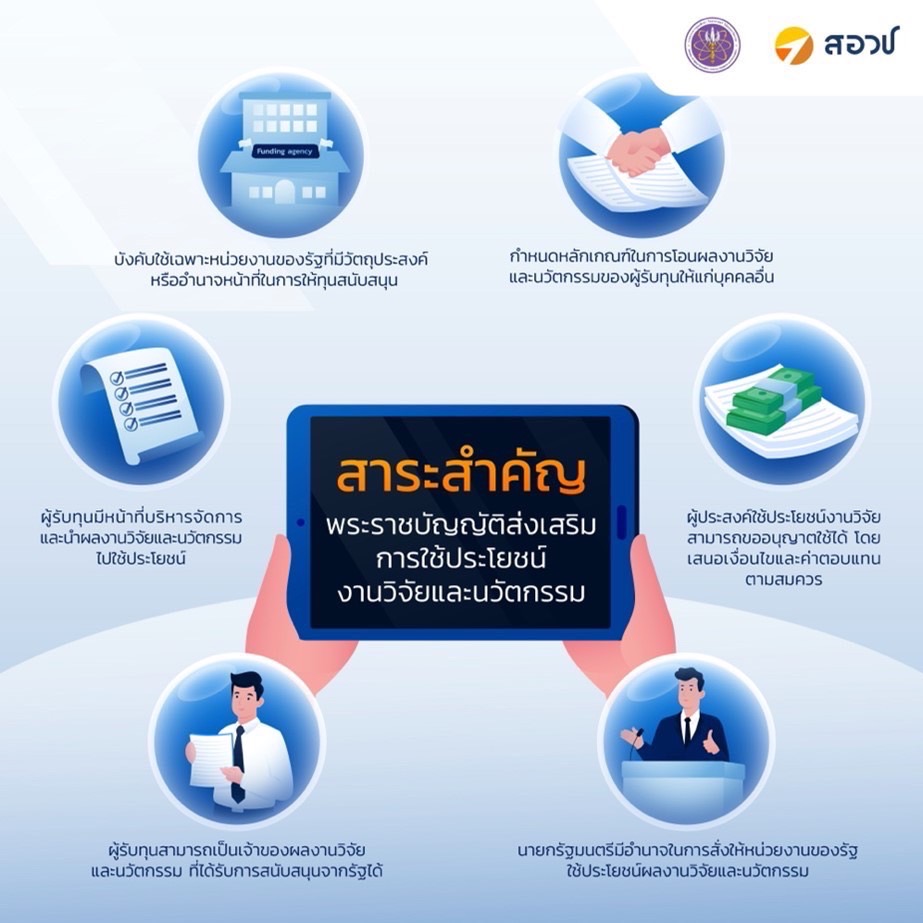 พระราชบัญญัติระเบียบบริหารราชการแผ่นดิน พ.ศ. 2534 ประกอบมาตรการ 31 วรรคสาม แห่งพระราชบัญญัติการส่งเสริมวิทยาศาสตร์ การวิจัยและนวัตกรรม พ.ศ. 2562 ส่งเสริมให้สถาบันอุดมศึกษาของรัฐ สถาบันวิจัย และหน่วยงานของรัฐที่มีภารกิจและวัตถุประสงค์ด้านการวิจัย และนวัตกรรม หน่วยงานอื่นของรัฐตามที่สภานโยบายการอุดมศึกษา วิทยาศาสตร์ วิจัยและนวัตกรรมแห่งชาติ กำหนด