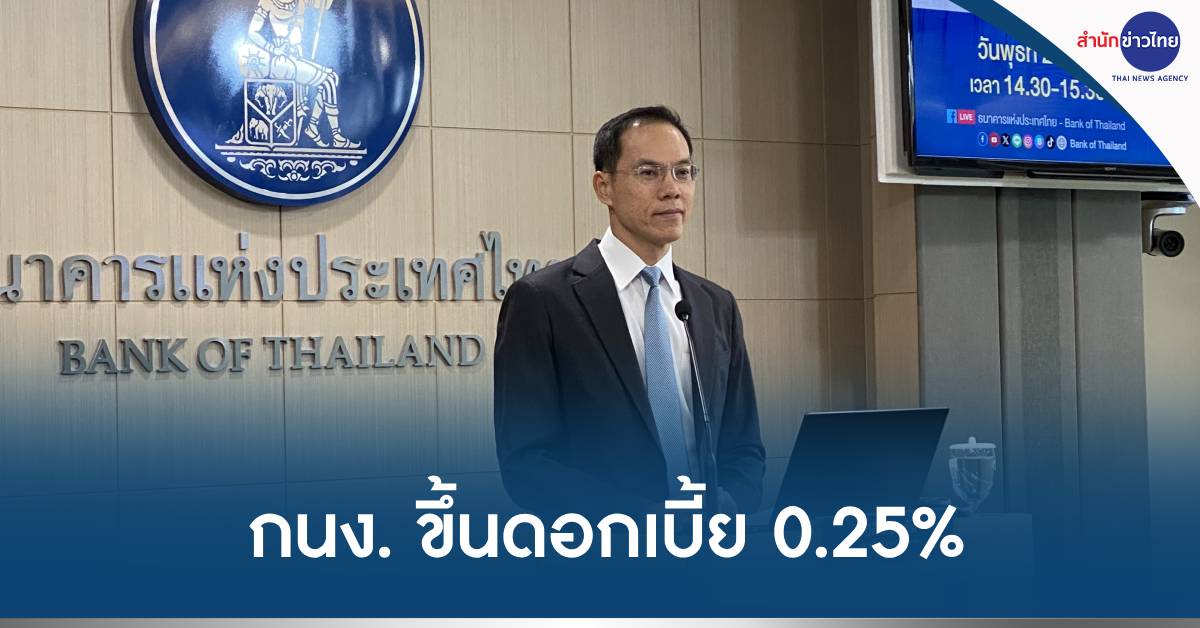 กรุงเทพฯ 2 ส.ค.-กนง. มีมติเป็นเอกฉันท์ให้ขึ้นอัตราดอกเบี้ยนโยบาย 0.25% ต่อปี จาก 2.00% เป็น 2.25% ต่อปี เหตุเศรษฐกิจต่างประเทศหลายด้านชะลอตัวแต่ยังต้องเฝ้าจับตา ขณะที่เศรษฐกิจไทยยังไม่ค่อยฟื้นตัว โดยมีปัจจัยด้านการส่งออกที่ชะลอตัวและความไม่แน่นอนทางการเมือง