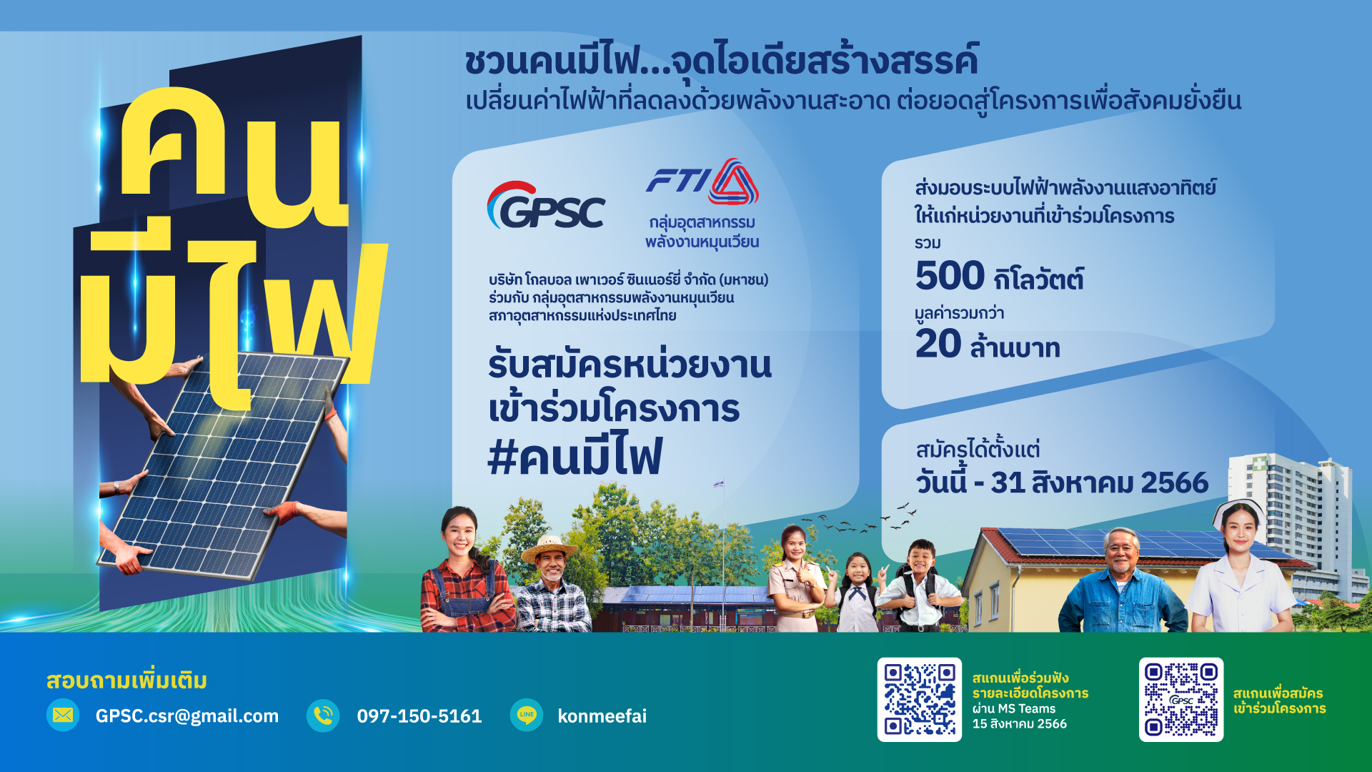 นางรสยา เธียรวรรณ รองกรรมการผู้จัดการใหญ่พัฒนาธุรกิจ บริษัท โกลบอล เพาเวอร์ ซินเนอร์ยี่ จำกัด (มหาชน) หรือ GPSC แกนนำนวัตกรรมธุรกิจไฟฟ้า กลุ่ม ปตท. เปิดเผยว่า GPSC ร่วมกับกลุ่มอุตสาหกรรมพลังงานหมุนเวียน สภาอุตสาหกรรมแห่งประเทศไทย (ส.อ.ท.) จัดโครงการ “คนมีไฟ” เพื่อขับเคลื่อนพลังงานสะอาดให้กับหน่วยงานที่ต้องการเปลี่ยนค่าใช้จ่ายด้านไฟฟ้าเป็นโครงการพัฒนาพื้นที่โดยรอบอย่างยั่งยืน ซึ่งจะเป็นการส่งมอบพลังงานสะอาด จากโซลาร์เซลล์แบบออนกริด (On-Grid) เพื่อสร้างประโยชน์ให้กับหน่วยงานรัฐที่มีการดำเนินงานด้านการศึกษา ด้านสาธารณสุข และด้านทรัพยากรธรรมชาติและสิ่งแวดล้อม รวมถึงองค์กรที่ไม่ได้สังกัดหน่วยงานของรัฐแต่มีการดำเนินงานที่ไม่แสวงหาผลกำไร โดยมีระยะเวลาในการดำเนินโครงการ 5 ปี ตั้งแต่ปี 2566-2570 มีกำลังการผลิตติดตั้งรวม 500 กิโลวัตต์ สามารถลดปริมาณก๊าซเรือนกระจกได้ราว 6,900 ตันคาร์บอนไดออกไซด์เทียบเท่า และคาดว่าจะใช้งบประมาณทั้งสิ้น 20 ล้านบาท โดยจะเริ่มติดตั้งในปี 2566 จำนวน 100 กิโลวัตต์