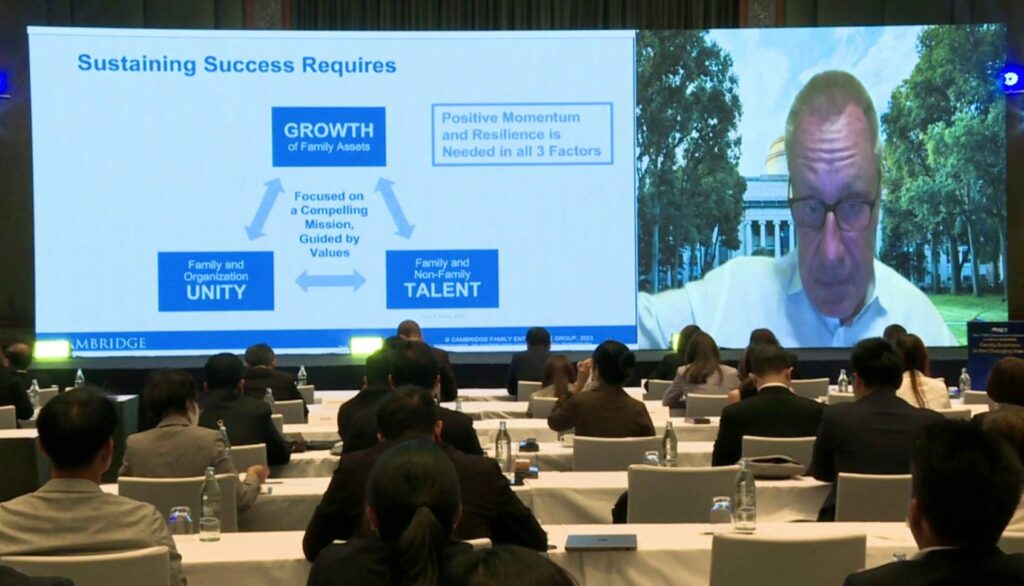 ศ.จอห์น เอ. เดวิด ประธานและผู้ก่อตั้งสถาบัน Cambridge Family Enterprise Group และผู้อำนวยการโปรแกรม Family Enterprise มหาวิทยาลัย MIT กล่าวปฐกถา ผ่านระบบวิดีโอคอนเฟอเรนซ์ ในหัวข้อ “The Future of Family Enterprise and How They Can be Successful in New World Order ” โดยมองว่าธุรกิจครอบครัวในภุมิภาคต่างๆทั่วโลกเจอปัญหาเดียวกัน คือการส่งผ่านไปยังรุ่นที่ 3 ทั้ง ยุโรป อเมริกา และเอเชีย โดยรุ่นที่ 1 จะเป็นการสร้าง รุ่นที่ 2 เป็นการต่อยอด และเมื่อถึงส่งต่อไปยังรุ่นที่ 3 จะเกิดปัญหา จึงเกิดคำถามสำคัญกับธุรกิจครอบครัวว่าทำอย่างไรจึงจะสามารถทำให้ธุรกิจเติบโตอย่างยั่งยืน มากไปกว่ารุ่นที่ 3 ซึ่งมีบริษัทที่ทำได้ทั้งในไทยและต่างประเทศ แต่ไม่มากนัก โดยมองว่าหัวใจสำคัญมี 3 ประเด็นที่จำทห้ให้ธุรกิจครอบครัวเกิดความยั่งยืน ประกอบด้วย ทำอย่างไรให้ธุรกิจเติบโตต่อเนื่อง (Growth) , พัฒนาความสามารถและทักษะ (Talent) , และมีความเป็นหนึ่งเดียว (Unity) ของคนในครอบครัว และจากรุ่นสู่รุ่น