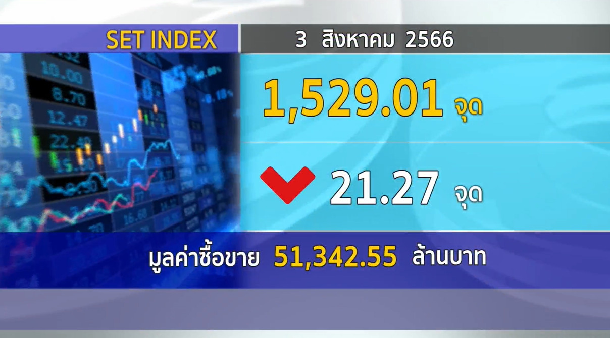 กทม. 3 ส.ค.-SET ปิดวันนี้ที่ 1,529.01 จุด ลดลง 21.27 จุด (-1.37%) มูลค่าซื้อขาย 51,342.55 ล้านบาท