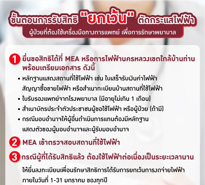 กรุงเทพฯ 4 ส.ค. – MEA แจ้งขั้นตอนการยกเว้นตัดกระแสไฟฟ้าบ้านผู้ป่วยที่ใช้ไฟฟ้าในการเดินเครื่องมือทางการแพทย์เพื่อการรักษาพยาบาล (ผู้ป่วยติดเตียง)