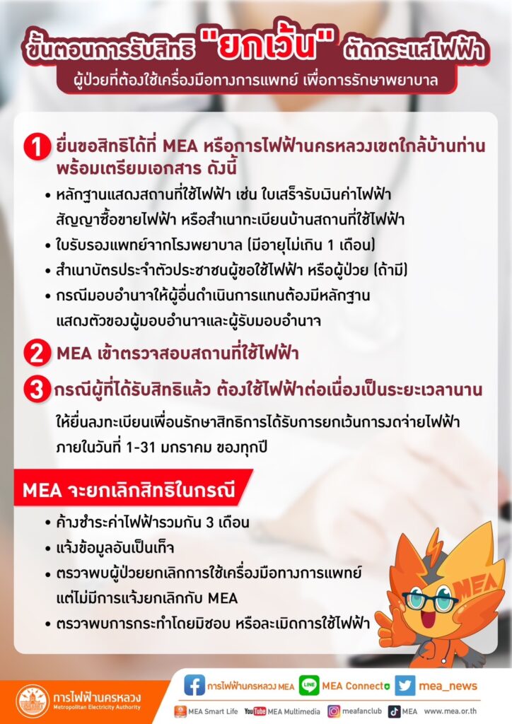 MEA ในฐานะหน่วยงานรัฐวิสาหกิจสังกัดกระทรวงมหาดไทย ดูแลระบบจำหน่ายไฟฟ้าในพื้นที่กรุงเทพมหานครนนทบุรี และสมุทรปราการ มีความตระหนักในการเป็นผู้จำหน่ายกระแสไฟฟ้าที่มีความมั่นคง เชื่อถือได้ และมีความห่วงใยต่อสังคมและสิ่งแวดล้อม ขับเคลื่อนพลังงานเพื่อวิถีชีวิตเมืองมหานคร พร้อมตอบสนองต่อนโยบายรัฐบาล ในการยกเว้นการงดจ่ายไฟฟ้าได้ในกรณีที่ผู้ใช้ไฟฟ้า หรือผู้ใช้ไฟฟ้าที่มีบุคคลอยู่ในความดูแล หรือมีผู้ป่วยที่มีความจำเป็นต้องใช้ไฟฟ้าในการเดินเครื่องมือทางการแพทย์เพื่อการรักษาพยาบาล ซึ่งนโยบายดังกล่าว MEA ดำเนินการตามประกาศของ กกพ. มาอย่างต่อเนื่อง โดยยืดระยะเวลาการค้างชำระค่าไฟฟ้ารวมกันได้ไม่เกิน 3 เดือน ยืดระยะเวลาที่จะถูกถอดเครื่องวัดหน่วยไฟฟ้า (มิเตอร์) หรือถูกถอดสาย ดังนั้น เพื่อให้ผู้ใช้ไฟฟ้า หรือผู้ใช้ไฟฟ้าที่มีบุคคลต้องอยู่ในความดูแล หรือมีผู้ป่วยที่มีความจำเป็นต้องใช้ไฟฟ้าในการเดินเครื่องมือทางการแพทย์ (เช่น เครื่องช่วยหายใจ เครื่องดูดเสมหะ ฯลฯ) เพื่อการรักษาพยาบาล สามารถลงทะเบียนรับสิทธิได้ที่การไฟฟ้านครหลวงเขตทุกเขต โดยการนำเอกสารหลักฐานแสดงสถานที่ใช้ไฟฟ้า (เช่น ใบเสร็จรับเงินค่าไฟฟ้า สัญญาซื้อขายไฟฟ้า หรือสำเนาทะเบียนบ้านสถานที่ใช้ไฟฟ้า) สำเนาบัตรประจำตัวประชาชนผู้ขอใช้ไฟฟ้า หรือผู้ป่วย (ถ้ามี) ใบรับรองแพทย์จากโรงพยาบาลที่มีอายุไม่เกิน 1 เดือน กรณีมอบอำนาจให้ผู้อื่นมาดำเนินการแทน ต้องมีหลักฐานแสดงตัวของผู้มอบอำนาจ และผู้รับมอบอำนาจให้ครบถ้วน กรณีผู้ที่ได้รับสิทธิแล้ว ต้องใช้ไฟฟ้าต่อเนื่องเป็นระยะเวลานาน ให้ยื่นลงทะเบียนเพื่อรักษาสิทธิการได้รับการยกเว้นการงดจ่ายไฟฟ้าภายในวันที่ 1-31 มกราคม ของทุกปี อย่างไรก็ตาม ผู้ใช้ไฟฟ้าที่ลงทะเบียนรับสิทธิจะต้องดำเนินการชำระค่าไฟฟ้าตามปกติตามจำนวนหน่วยที่ตนใช้งาน หากค้างชำระเกิน 3 เดือน หรือการกระทำอื่น ๆ ที่มีความผิดเกี่ยวกับการใช้ไฟฟ้า หรือไม่ตรงตามระเบียบการใช้ไฟฟ้าดังกล่าว MEA จะงดจ่ายไฟฟ้า หรือยกเลิกสิทธิดังกล่าวแก่ผู้ใช้ไฟฟ้า โดยจะมีหนังสือแจ้งเตือนให้ทราบล่วงหน้า