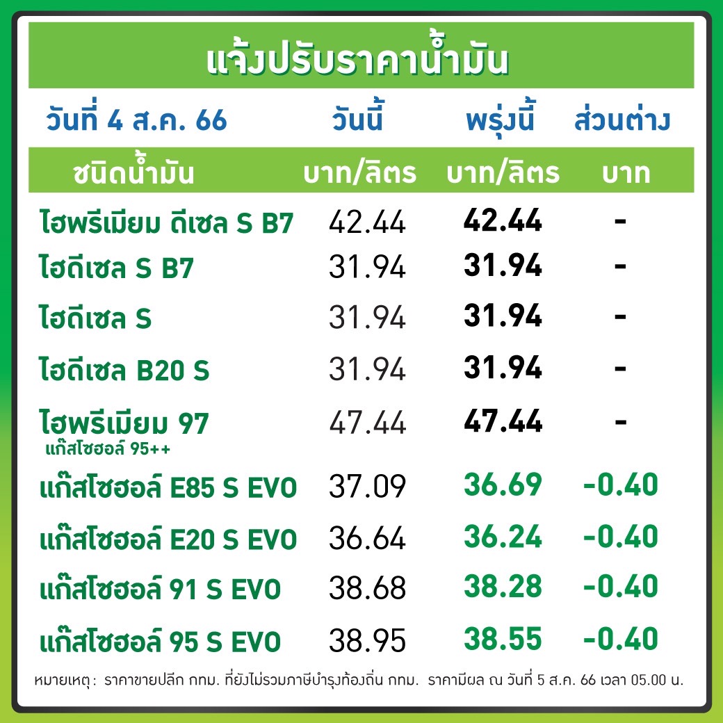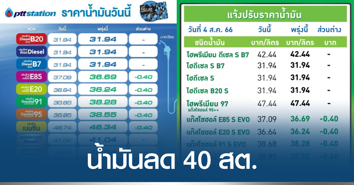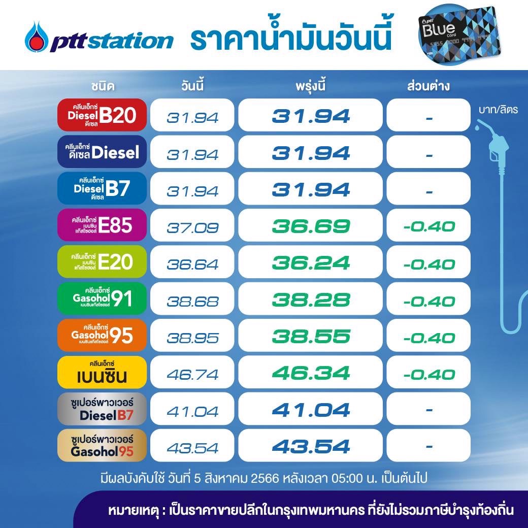 PTT Station ปรับราคาขายปลีกน้ำมันเบนซินและแก๊สโซฮอล์ทุกชนิดลดลง 0.40 บาท/ลิตร ส่วนพรีเมี่ยม GSH95 และกลุ่มดีเซลทุกชนิดคงเดิม มีผล 5 ส.ค.66 เวลา 05.00 น. เป็นต้นไป โดยราคาขายปลีกจะเป็นดังนี้ ULG = 46.34, GSH95 = 38.55, E20 = 36.24, GSH91 = 38.28, E85 = 36.69, พรีเมี่ยม GSH95 = 43.54, HSD-B7 = 31.94, HSD-B10 = 31.94, HSD-B20 = 31.94, พรีเมี่ยมดีเซล B7 = 41.04 บาท/ลิตร โดยราคาขายปลีกข้างต้นยังไม่รวมภาษีบำรุงกรุงเทพมหานคร