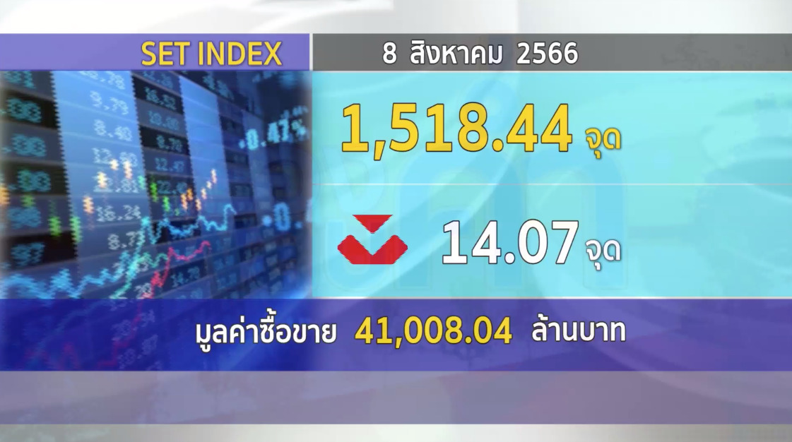 กทม. 8 ส.ค.- SET ปิดวันนี้ที่ 1,515.44 จุด ลดลง 14.07 จุด (-0.92%) มูลค่าการซื้อขาย 41,008.04 ล้านบาท