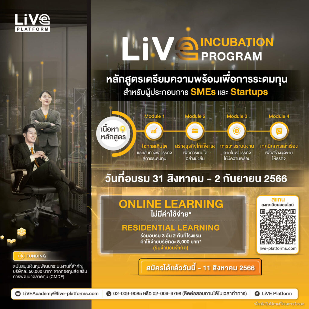 ตลาดหลักทรัพย์ไลฟ์เอ็กซ์เช้นจ์ (LiVEx) ชวนผู้ประกอบการ SMEs และ Startups ร่วมโครงการ LiVE Incubation Program รุ่นที่ 2 หลักสูตรเตรียมความพร้อมผู้ประกอบการสู่โอกาสการระดมทุนเพื่อการเติบโต ระหว่างวันที่ 31 ส.ค. – 2 ก.ย.2566 ร่วมเรียนรู้ผ่านการอบรมใน 4 เนื้อหาสำคัญ ประกอบด้วย