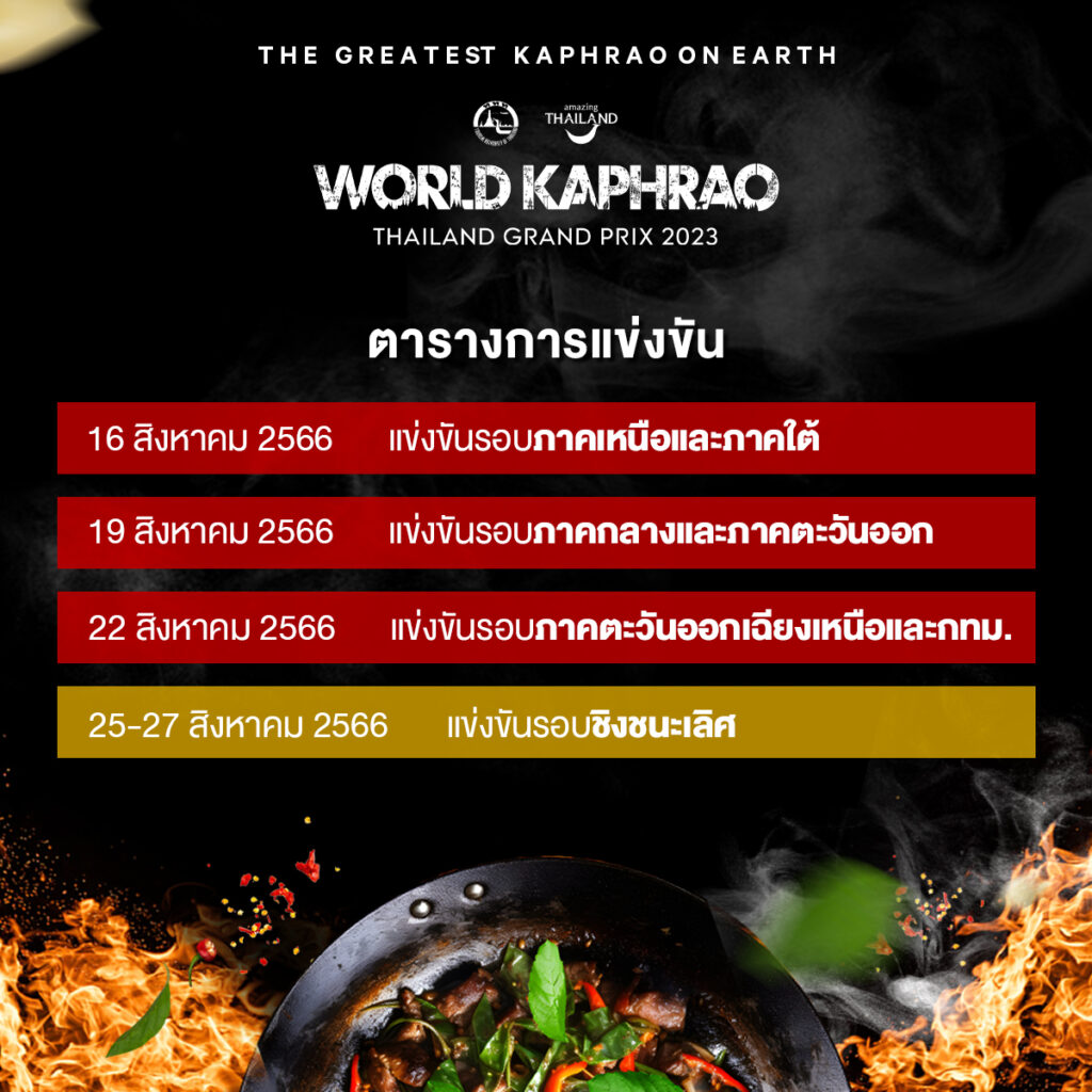 ททท. ได้กำหนดจัดงาน “World Kaphrao Thailand Grand Prix 2023” ระหว่างวันที่ 25-27 สิงหาคม 2566 ตั้งแต่เวลา 15.00 – 22.00 น. ณ บริเวณริมคลองผดุงกรุงเกษม (หัวลำโพง) กรุงเทพฯ ภายใต้แนวคิด “The Greatest Kaphrao on Earth” ที่สุดของกะเพราในโลกนี้ที่จะนำเสนอเรื่องราวและวัฒนธรรมของเมนูผัดกะเพราทั้งในรูปแบบดั้งเดิมและแบบสมัยใหม่ พร้อมเปิดโอกาสให้นักท่องเที่ยวและเหล่าผู้ที่ชื่นชอบการกิน ได้ลิ้มลองรสชาติความอร่อยของเมนูกะเพราที่หลากหลาย และได้รักษาเอกลักษณ์ อัตลักษณ์ และมาตรฐานของภูมิปัญญาอาหารไทย รวมถึงให้ผู้ประกอบการสามารถนำสูตรอาหารไปสร้างโอกาส สร้างอาชีพ สร้างรายได้ และเผยแพร่เมนูกะเพราให้เป็นที่รู้จักแพร่หลายในระดับโลก